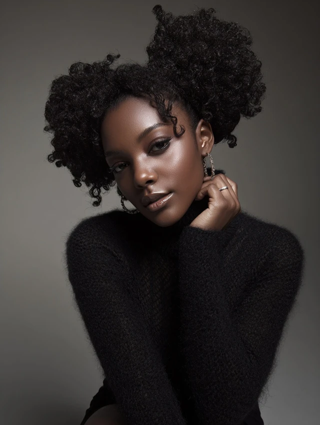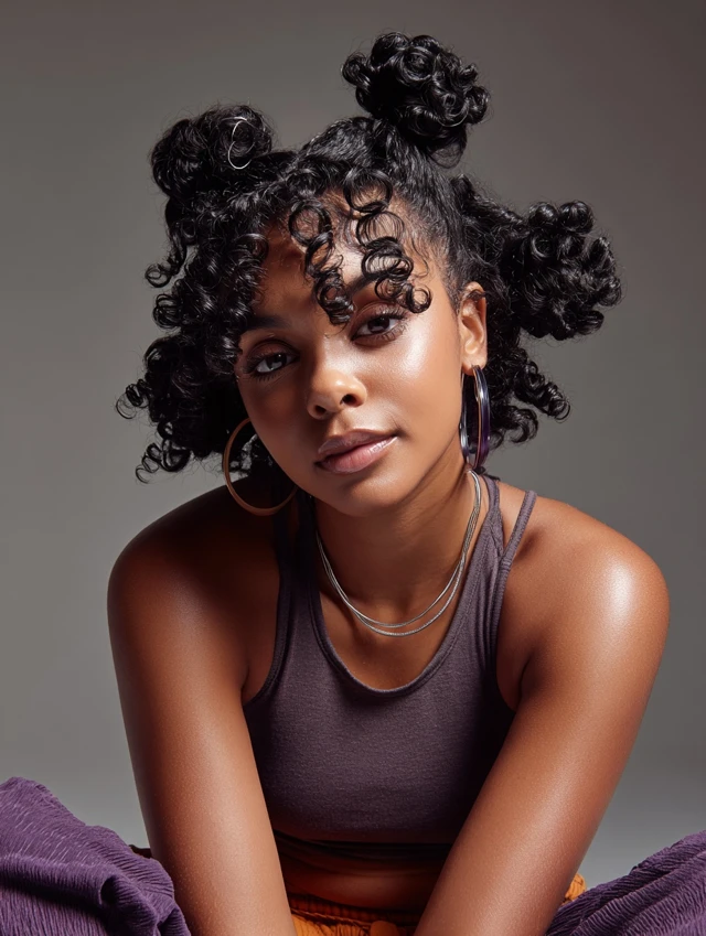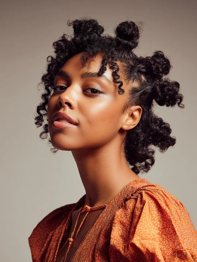 Afro puffs highlight texture and volume while managing awkward length. Works for oval, round, and diamond face shapes by emphasizing natural hair density.