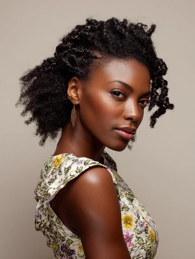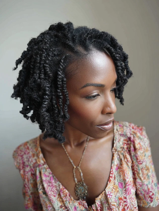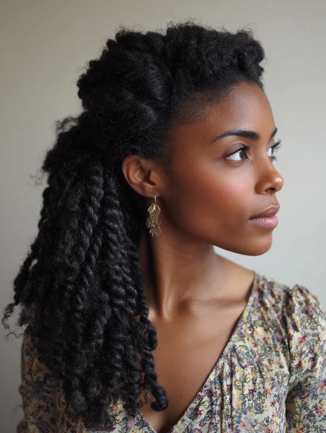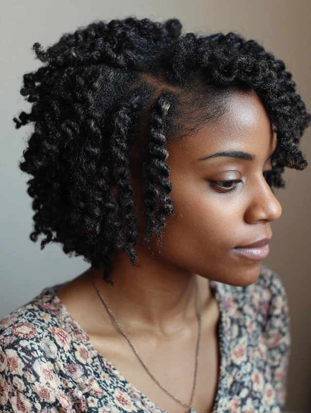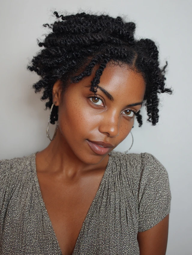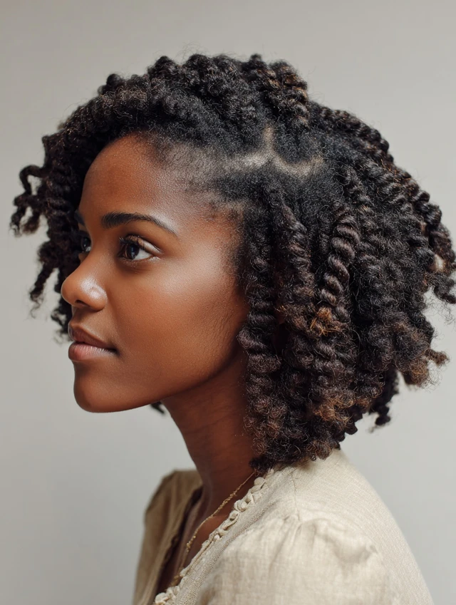 Medium-length 4C hair is ideal. Use light gel or cream to define top twists. Maintenance is simple, with touch-ups to reduce frizz. Perfect for professional or casual settings.