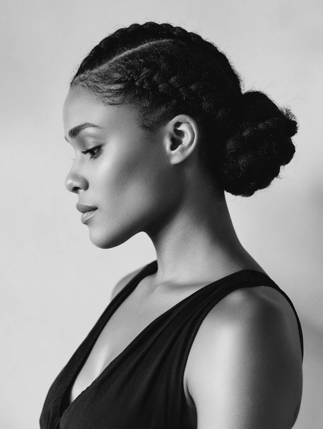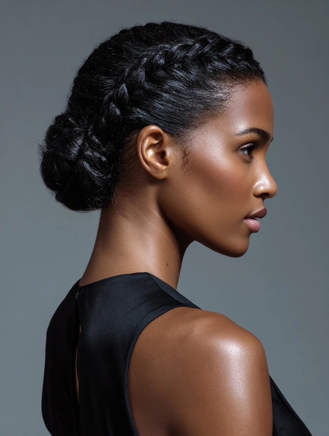 Flat twists create a sleek look while gathering hair into a bun at the crown or nape. This style suits oval and heart-shaped faces, elongating features.