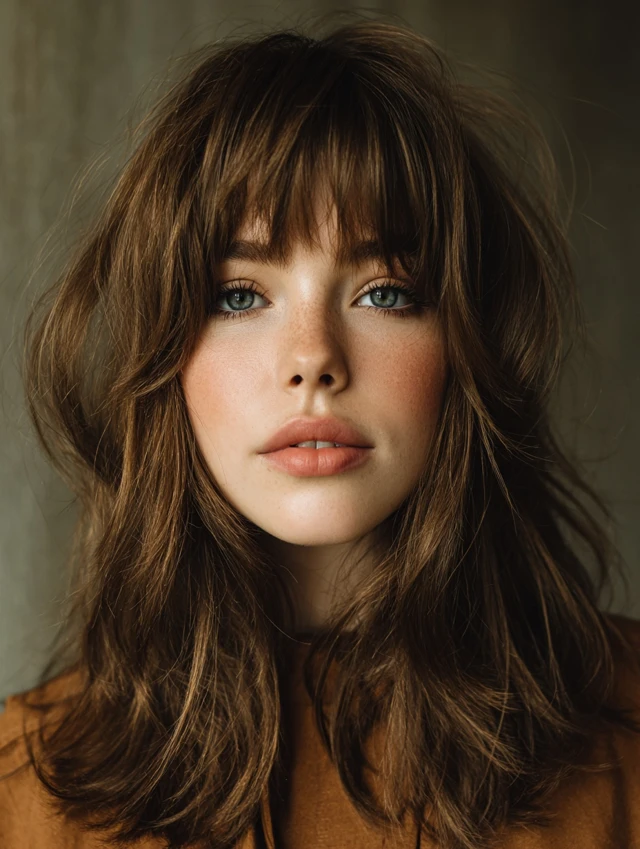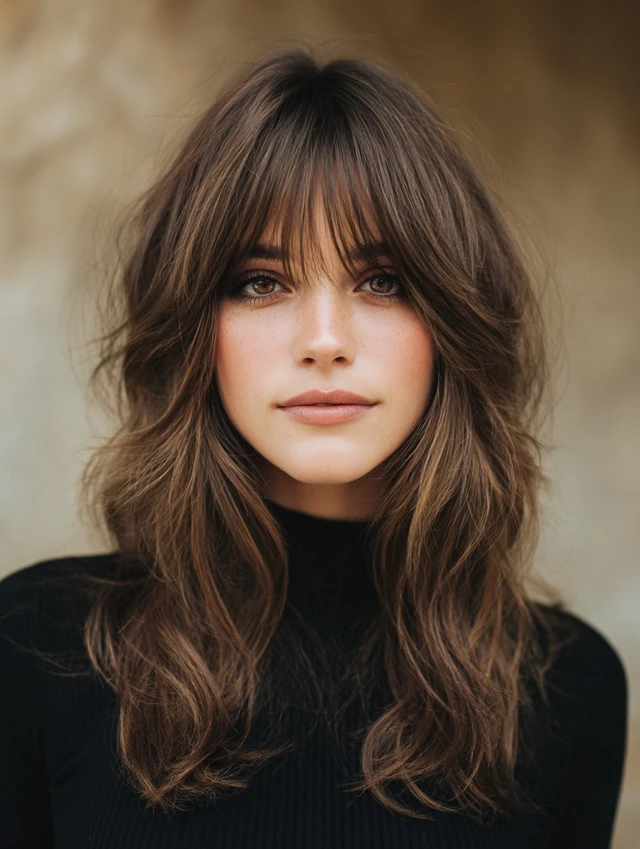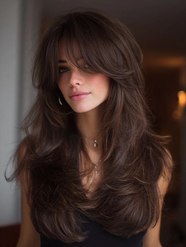 Curtain bangs enhance the face-framing layers. They blend seamlessly into the cascading sections. This flatters heart and oval face shapes.
