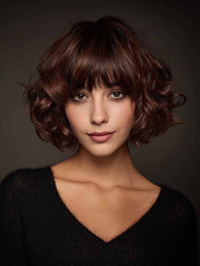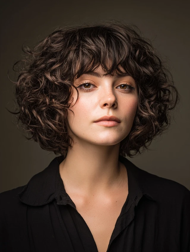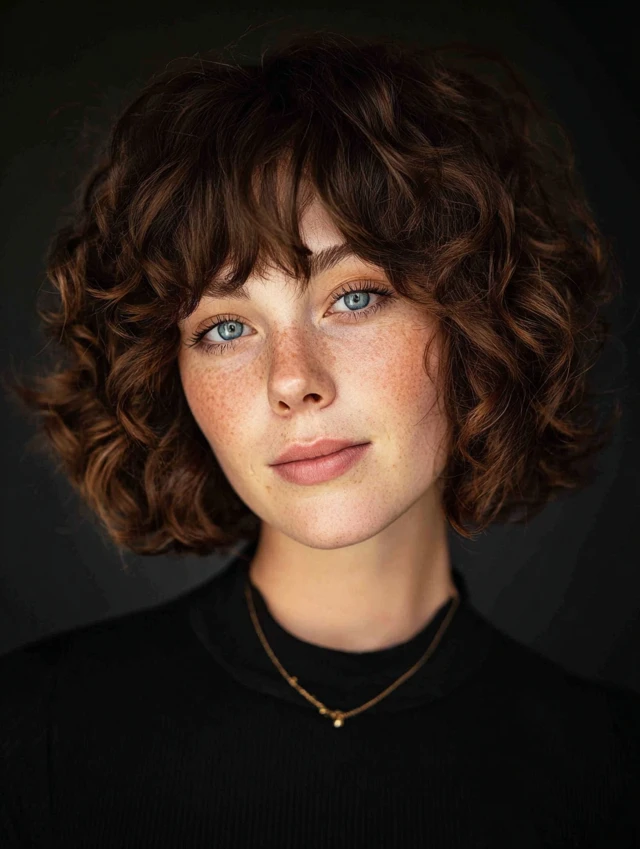 This shape stacks layers to support curl patterns and avoid bulk at the sides. Curly bangs sit softly across the forehead instead of stiff or blunt. The rounded outline keeps proportions balanced.