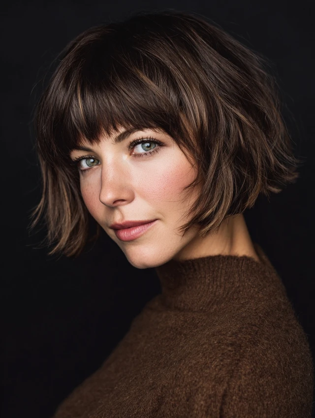 Chin-length bob hairstyles with bangs succeed because the cut shapes the face from two directions. The jaw-length perimeter gives definition. The fringe shortens the forehead visually and centers attention on the eyes. That combination keeps proportions flattering and controlled.