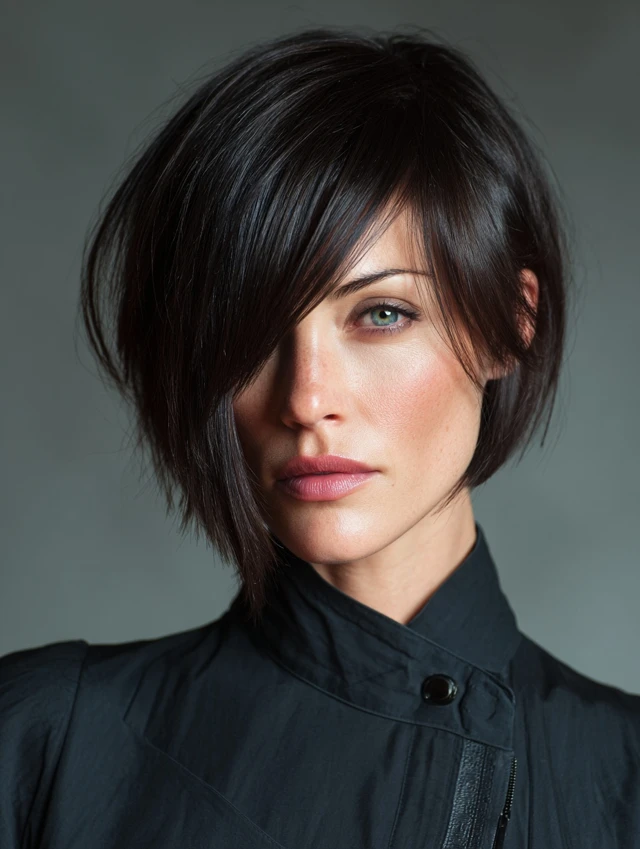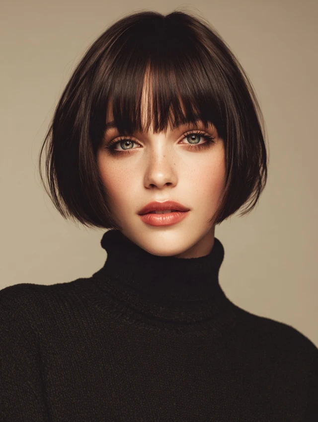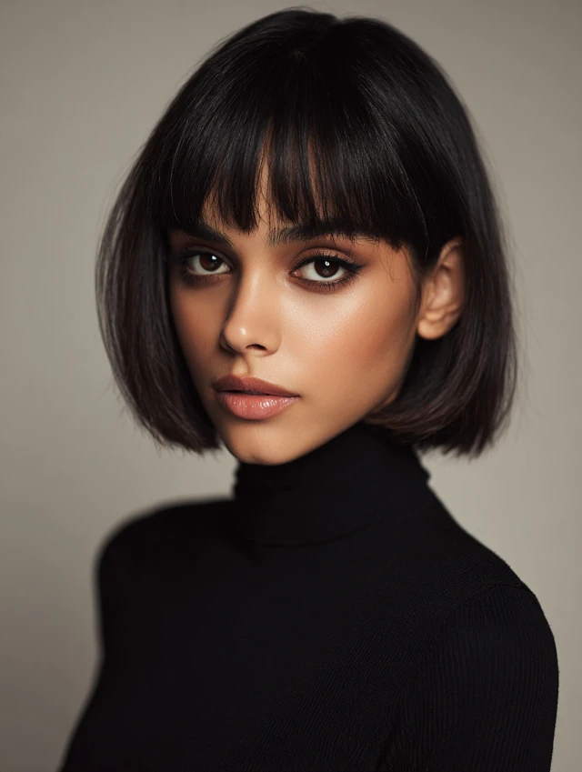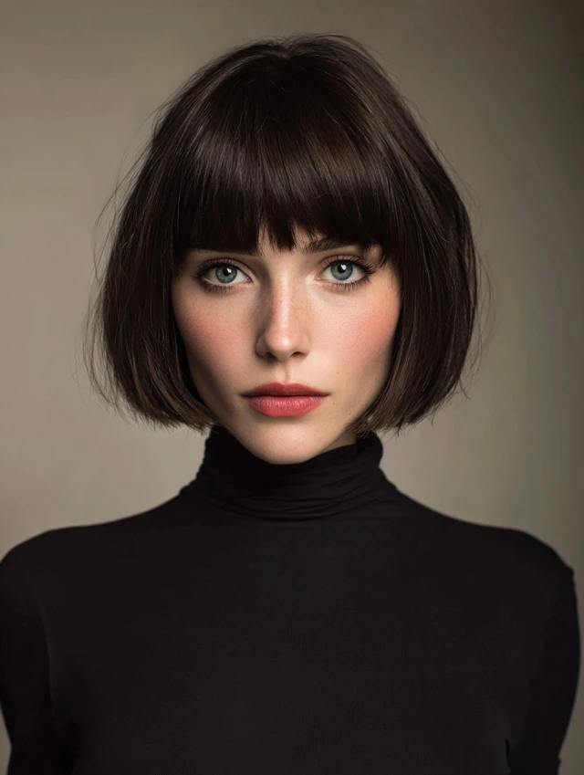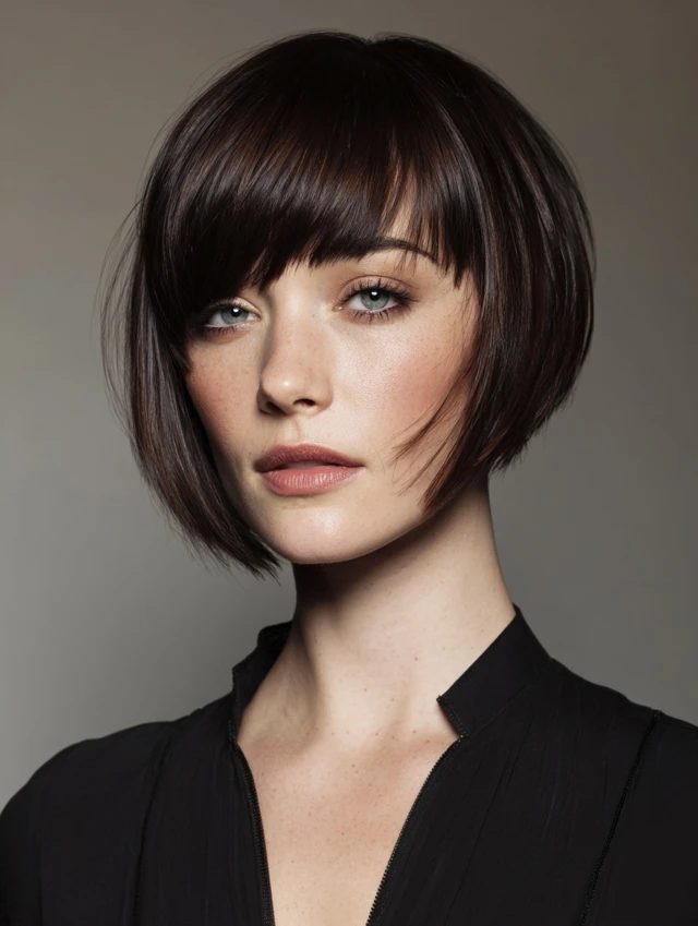 This version keeps the outline blunt with crisp bangs across the forehead. The sharp geometry feels modern and bold. It works well for longer face shapes because the fringe shortens visual length and centers the features.