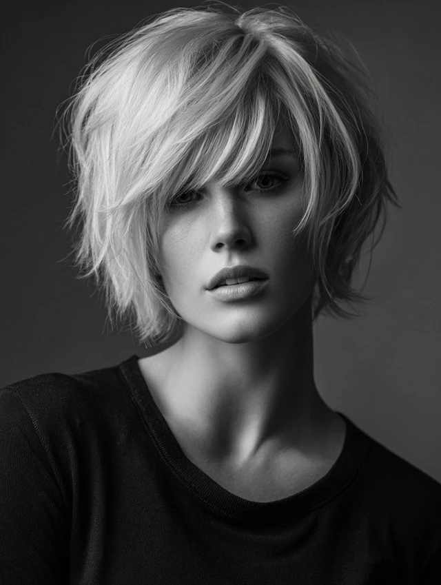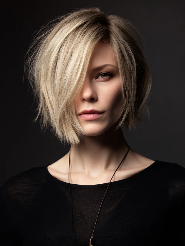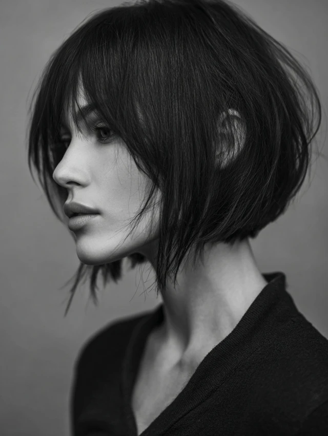This cut sits between the jaw and chin. Choppy layers remove weight while keeping the outline strong. The shape adds lift at the crown, which helps fine hair look fuller. It works well for oval and round faces because it opens the cheek area without widening the jaw.