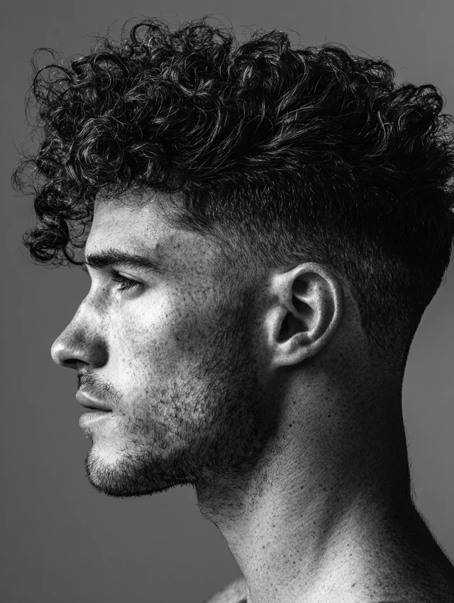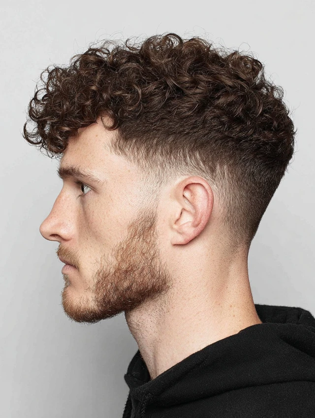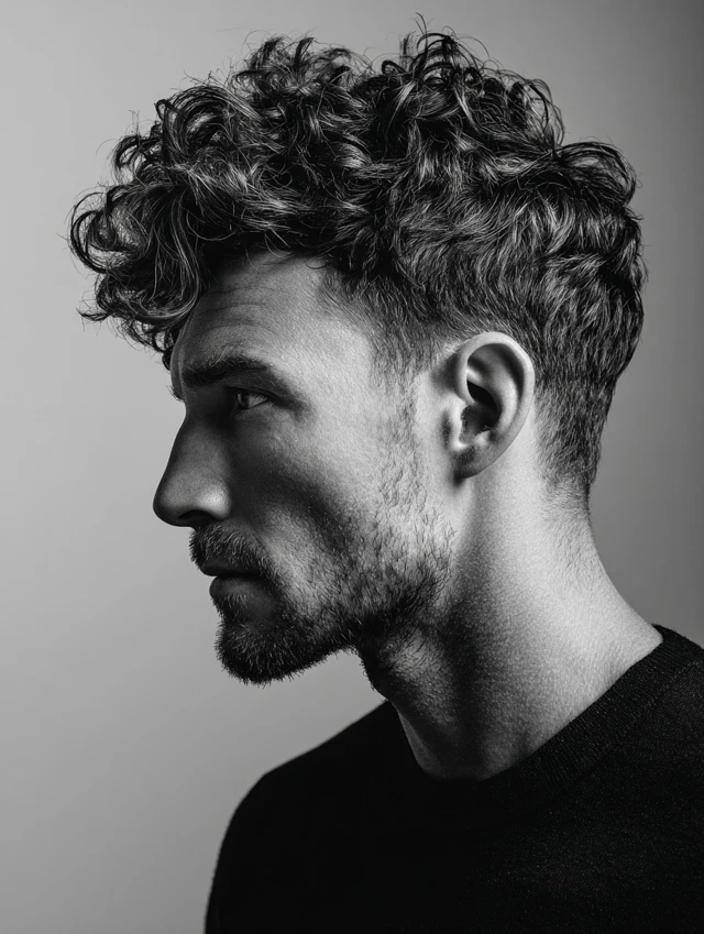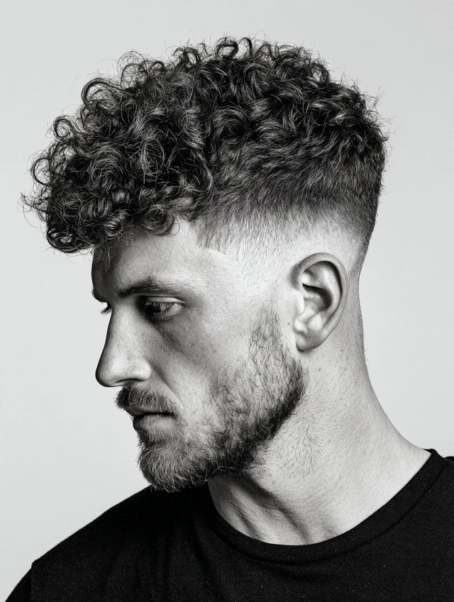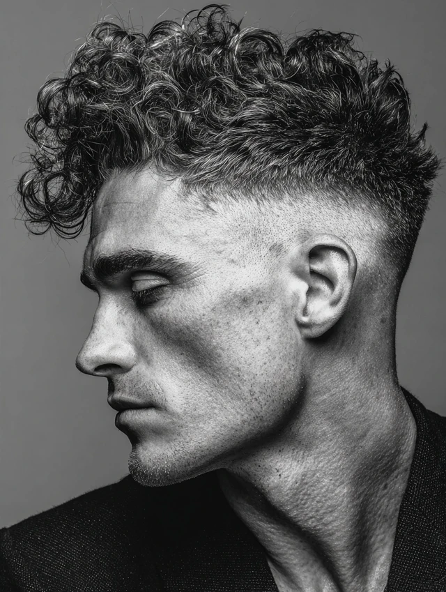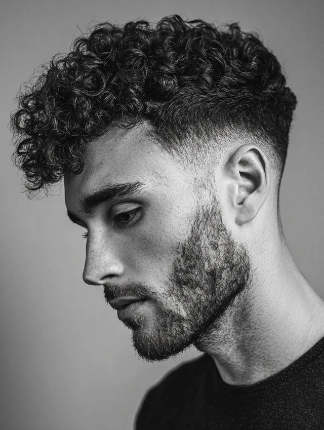 Fine, loose curls respond well to mousse or sea salt spray. Air-dry or diffuse for natural volume. It suits men who prefer a casual, low-maintenance style. Trims every 6–8 weeks keep the curls healthy without losing the fade shape.