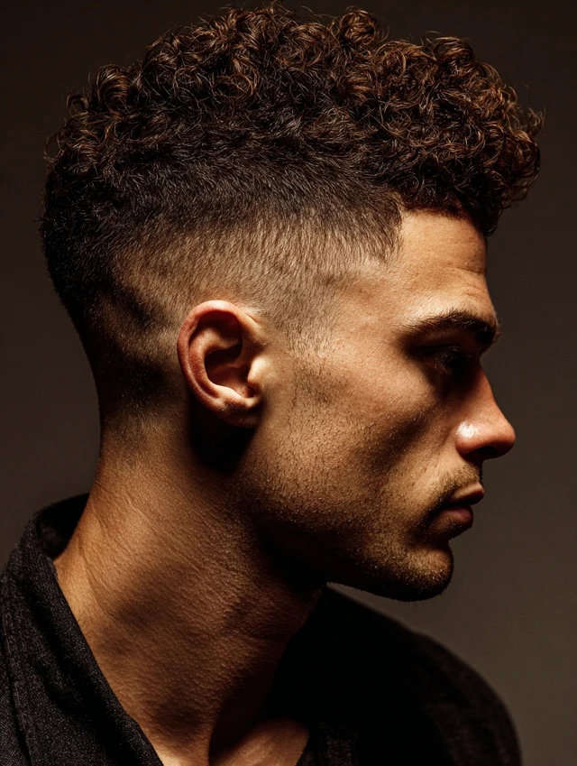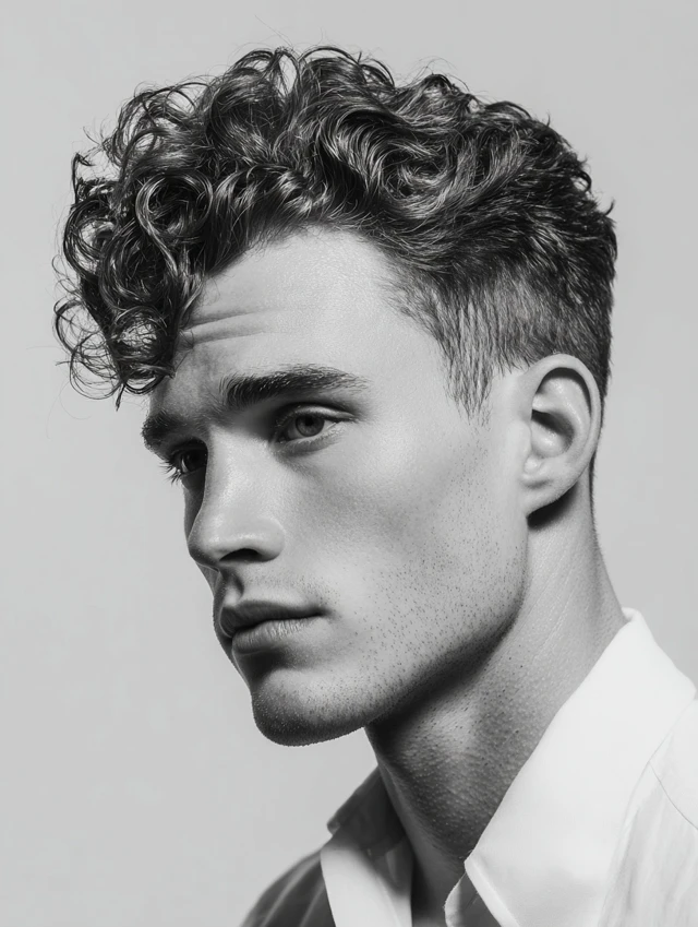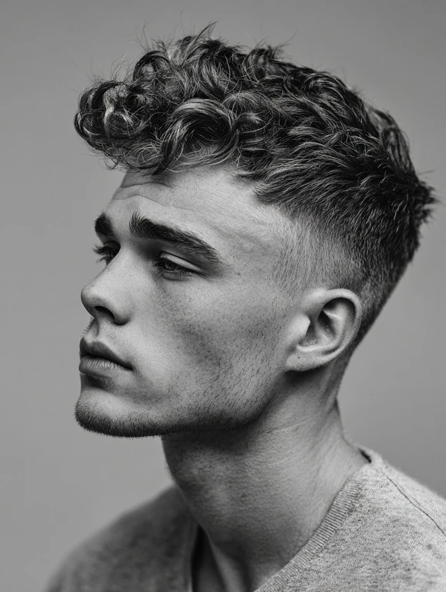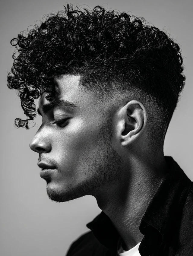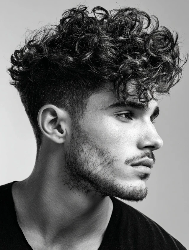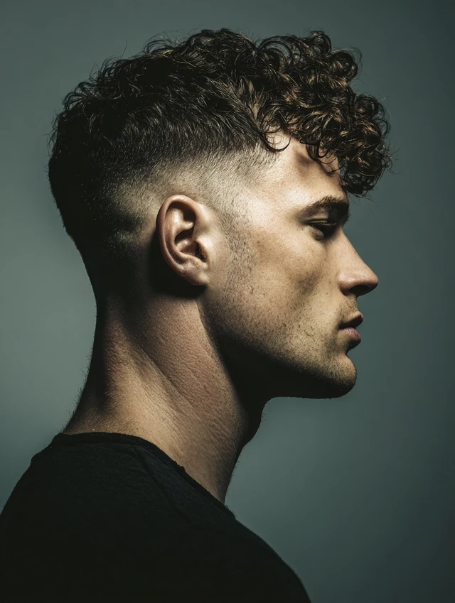 Fine, loose curls respond well to mousse or sea salt spray. Air-dry or diffuse for natural volume. It suits men who prefer a casual, low-maintenance style. Trims every 6–8 weeks keep the curls healthy without losing the fade shape.