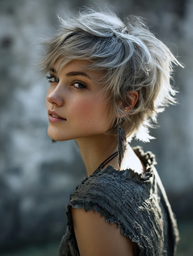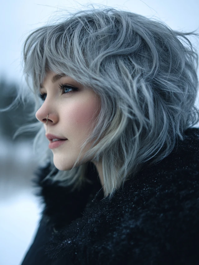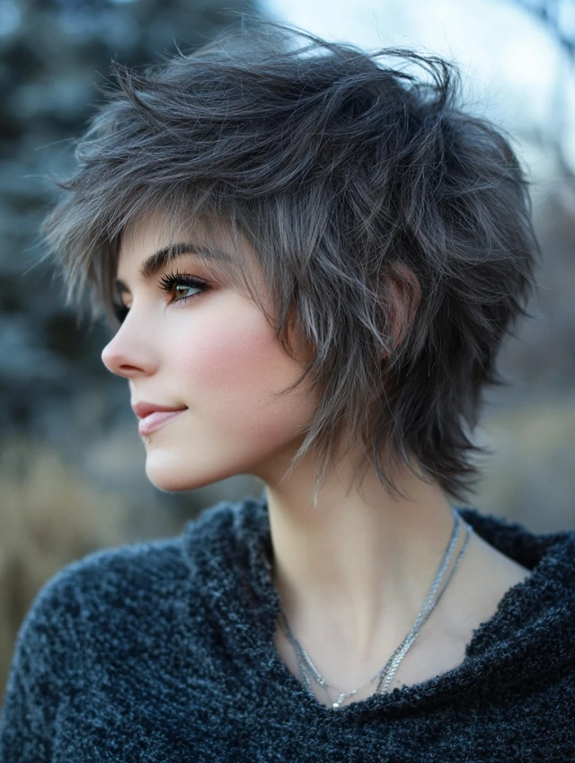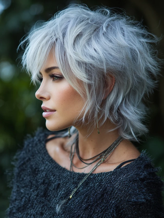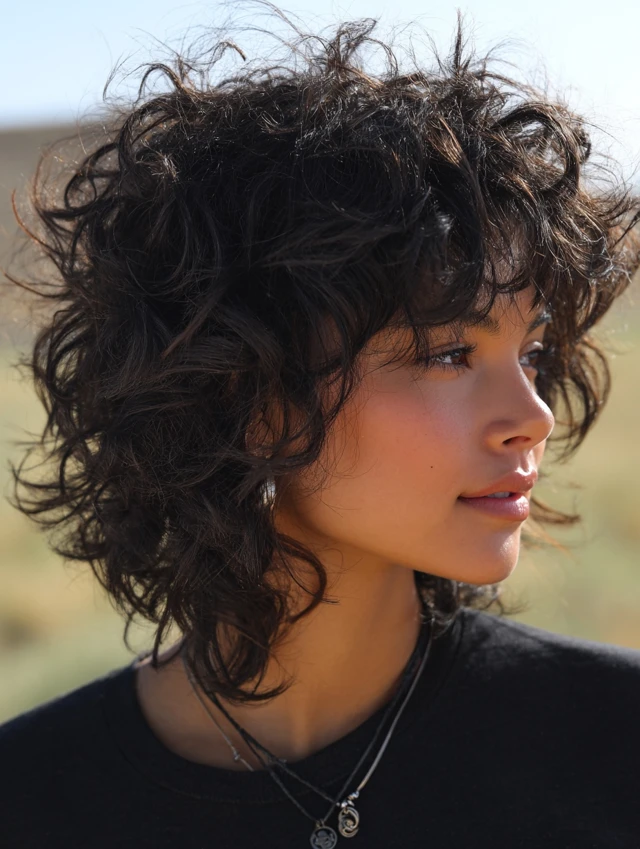 A short fluffy wolf cut emphasizes texture and lift. The layers create volume at the top while keeping the sides controlled. It works well for fine to medium hair that needs fullness.
