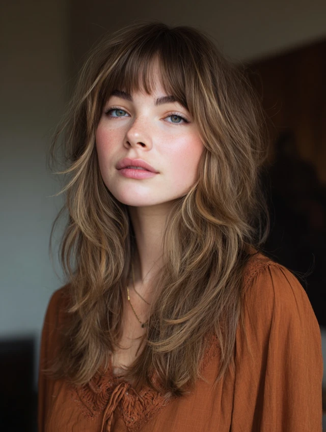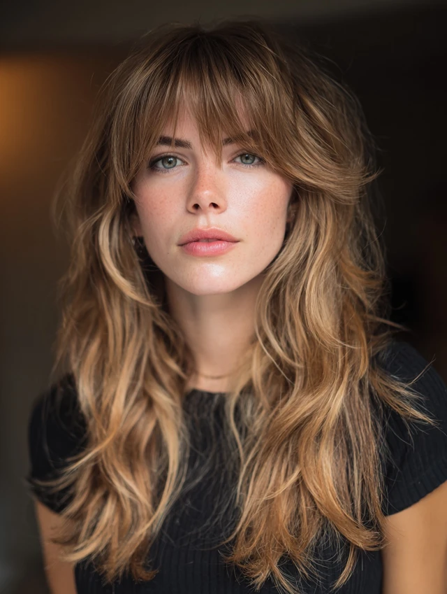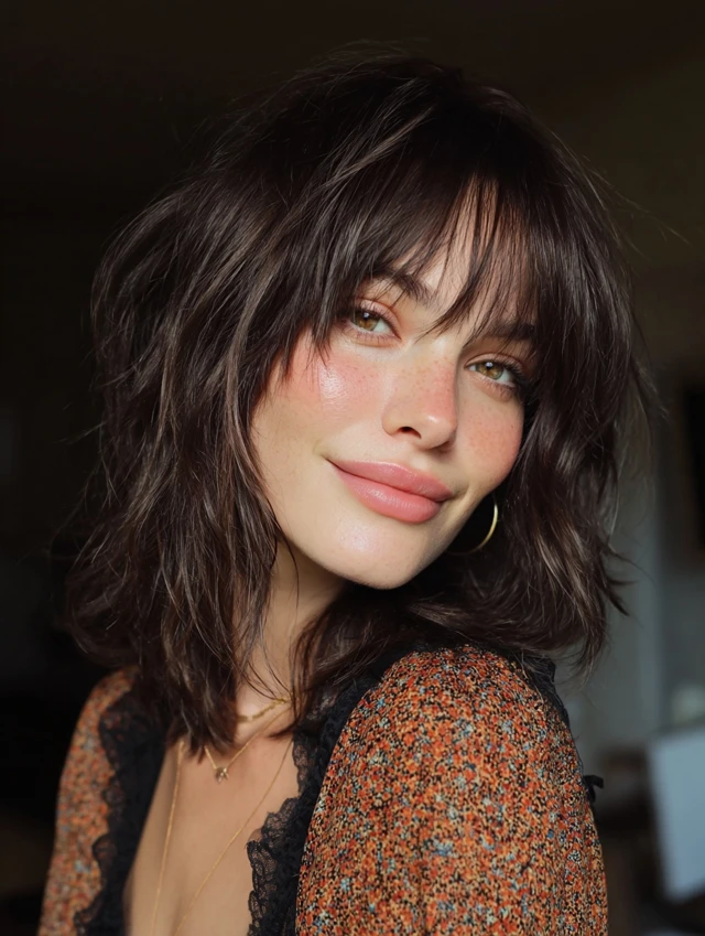 Adding curtain bangs makes the fluffy wolf cut softer around the face. The bangs blend into the layered sides, creating smooth transitions. This style flatters round and square faces by adding vertical lines.