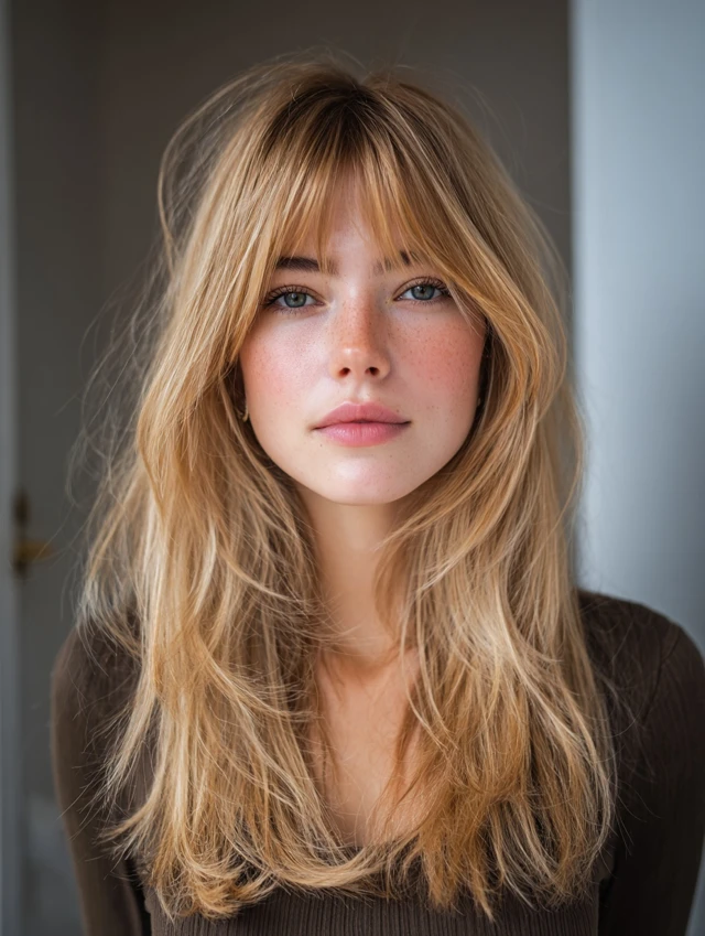 It suits medium to thick hair that holds volume. Blow-dry the bangs outward for a soft flip. The airy layers reduce weight while keeping fullness. This option works well for both casual and semi-formal settings.