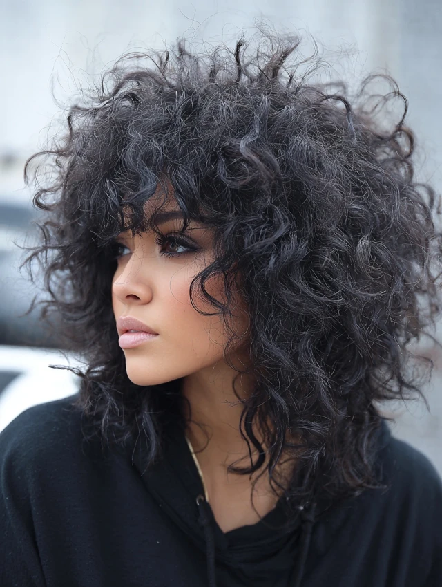 Hydrate curls with leave-in conditioner and define with curl cream. Diffuse carefully to maintain bounce. This style highlights cheekbones and eyes. It works for events, photos, and everyday wear because curls naturally hold volume.