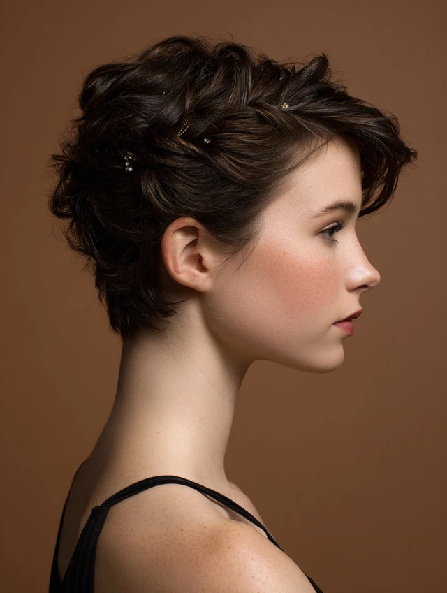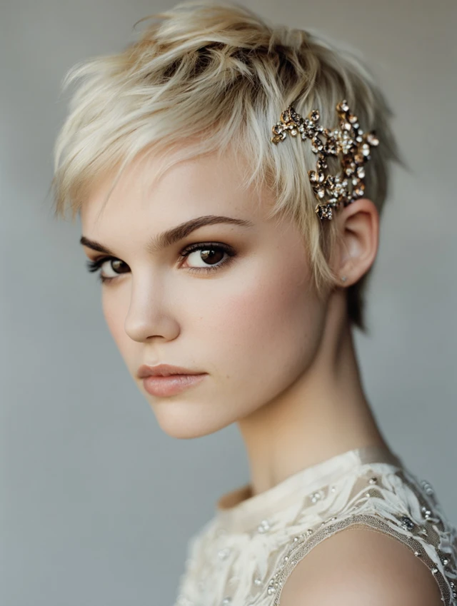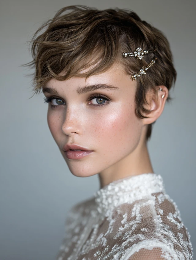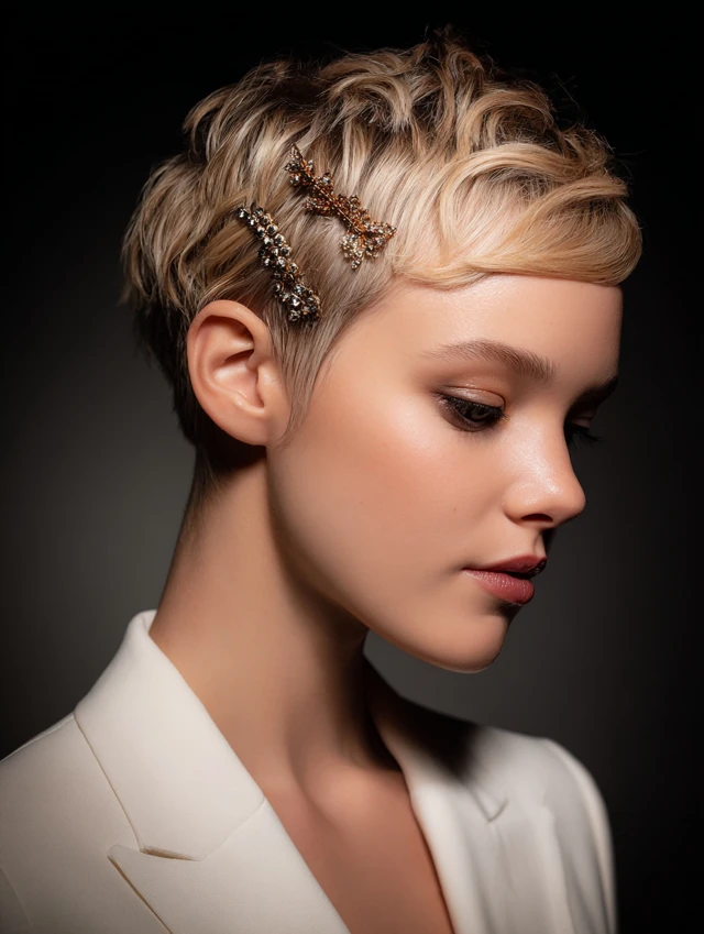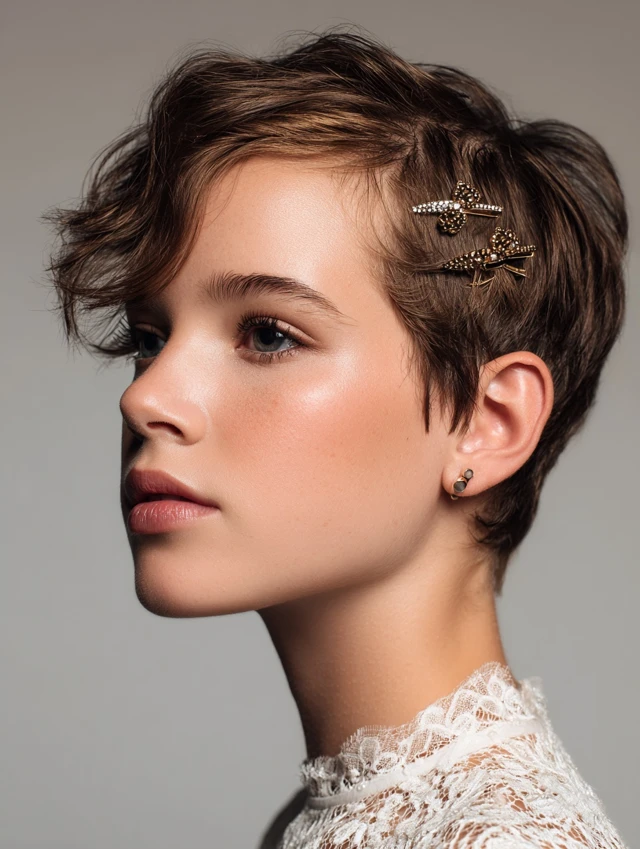 Add elegant clips, pins, or jeweled headbands to a short pixie. Works for all face shapes, instantly transforming a casual cut into a formal style.