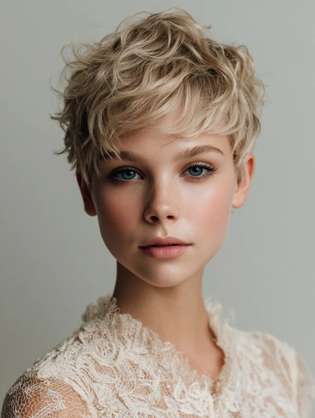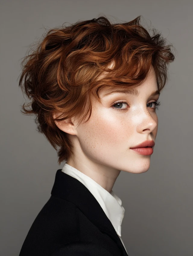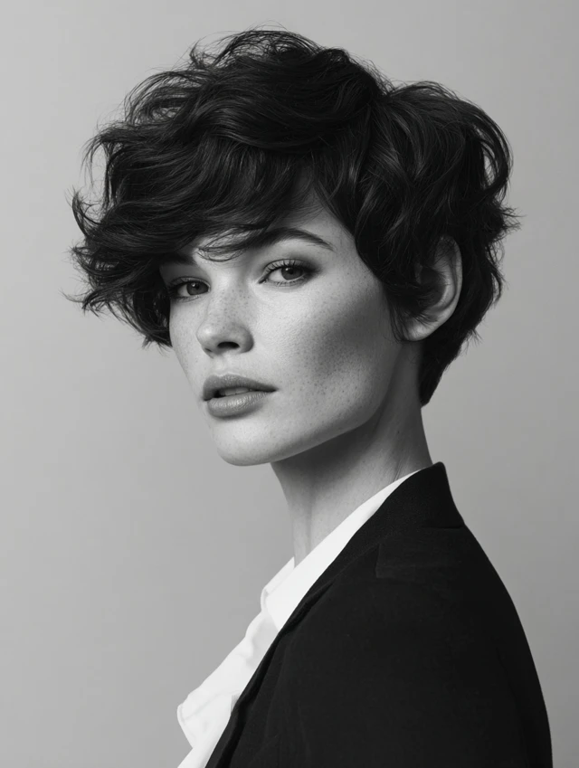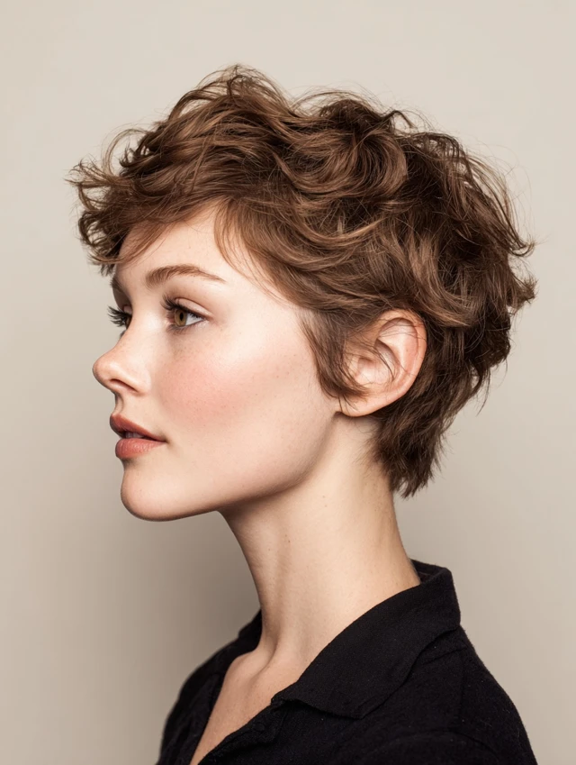 Soft waves add texture and movement to a short pixie cut. Works for oval, round, and heart-shaped faces, creating volume and softness around the face.