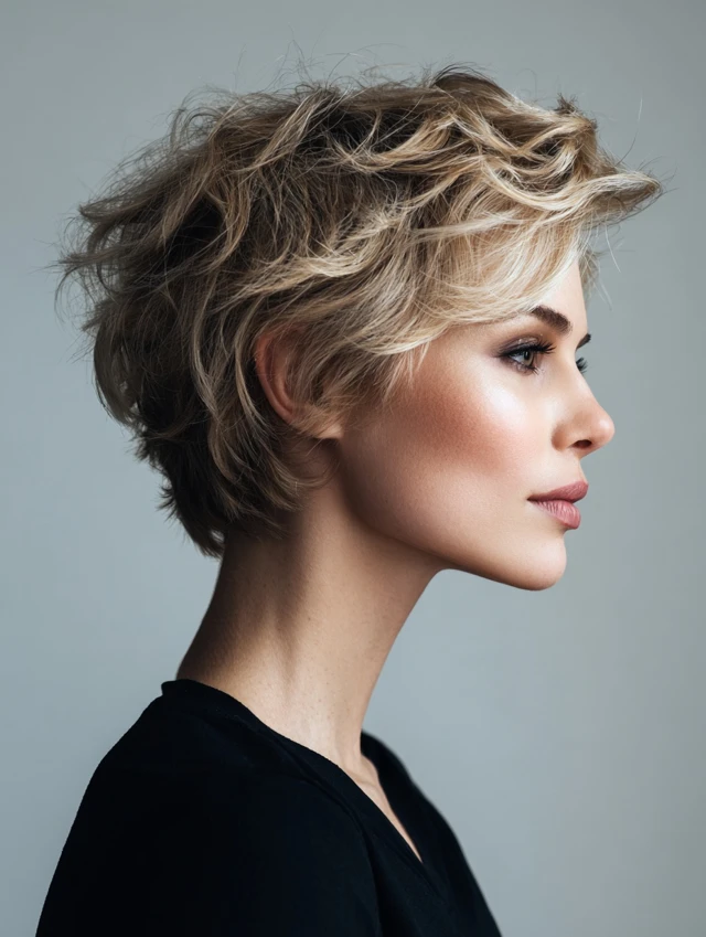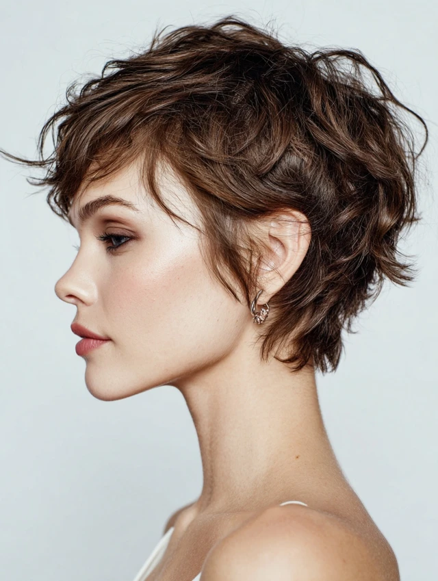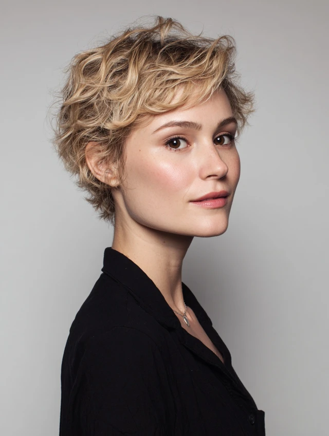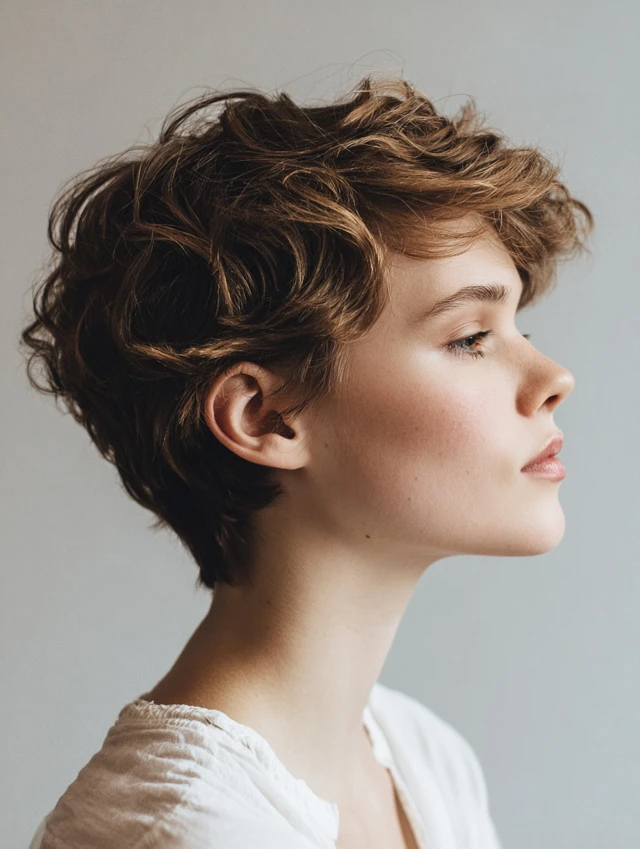 A wavy pixie cut creates volume at the crown and adds playful texture. It suits oval and square faces, highlighting cheekbones and eyes.