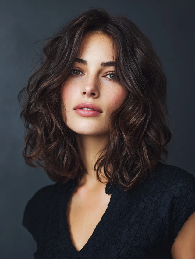 A layered lob adds dimension and movement to thin wavy hair. It works for oval, round, and heart-shaped faces by framing features without overwhelming them.