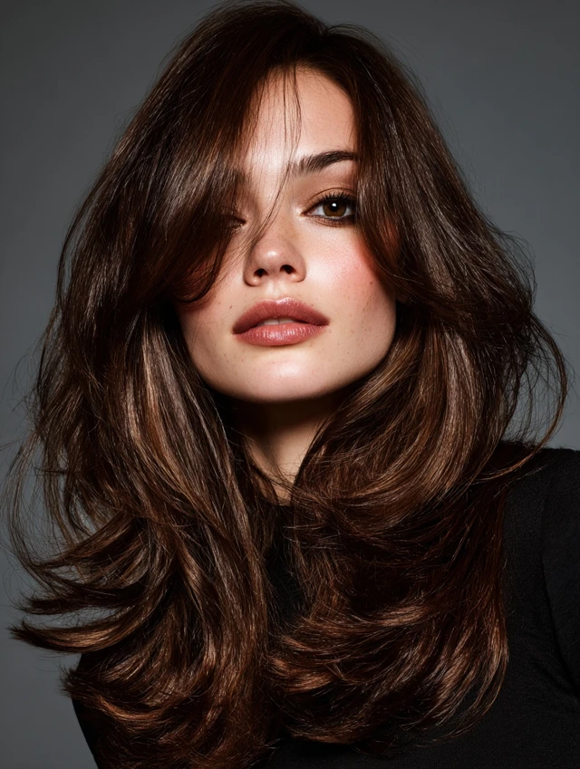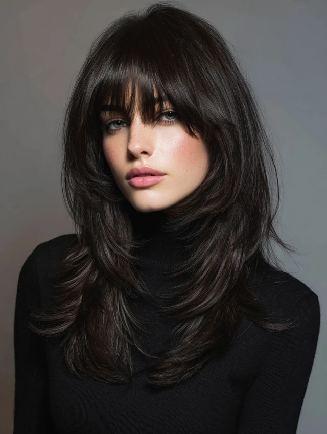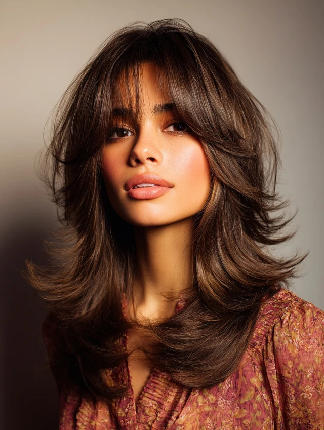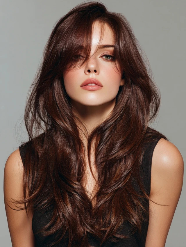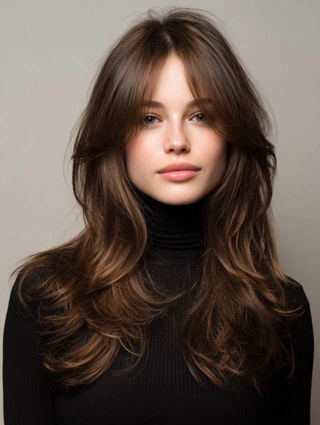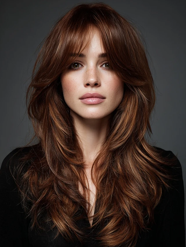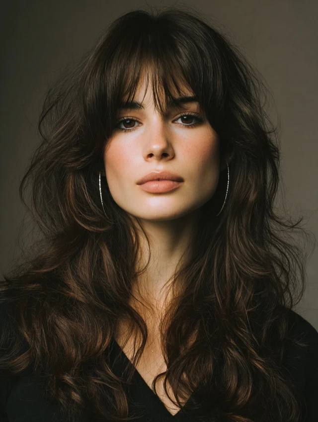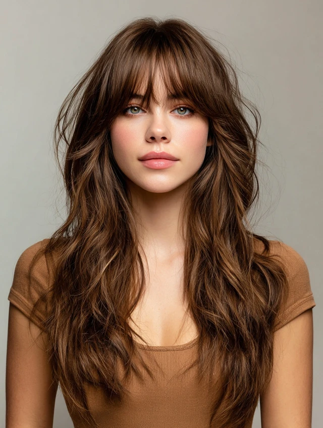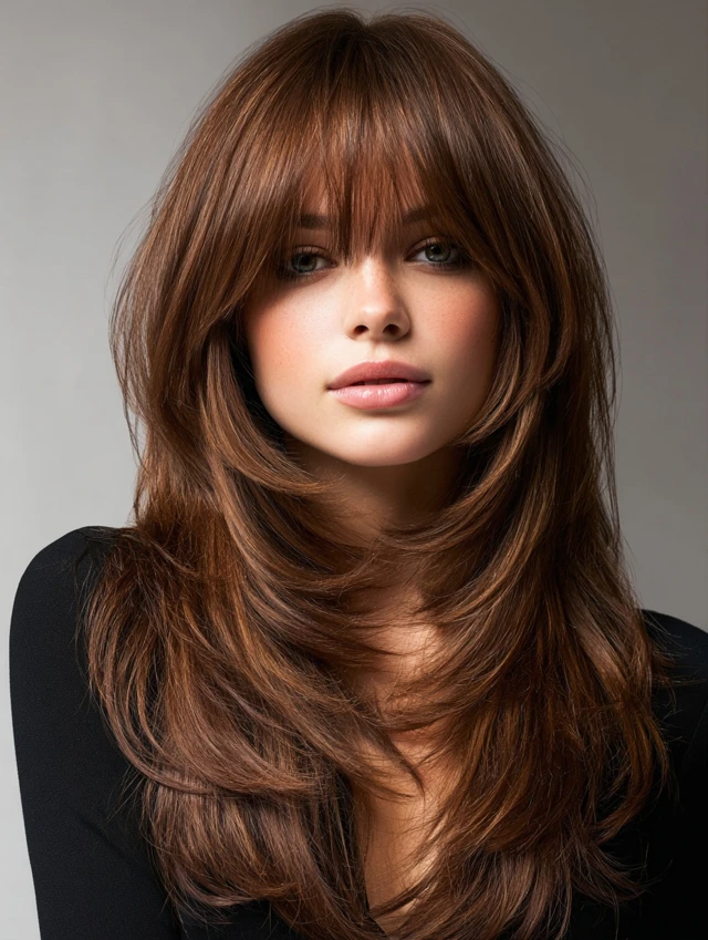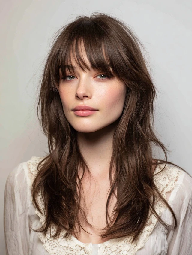 Soft, airy bangs skim the brows while longer layers flow past the shoulders. This combo hides part of the forehead without closing off the face completely. It suits long and oval face shapes well.