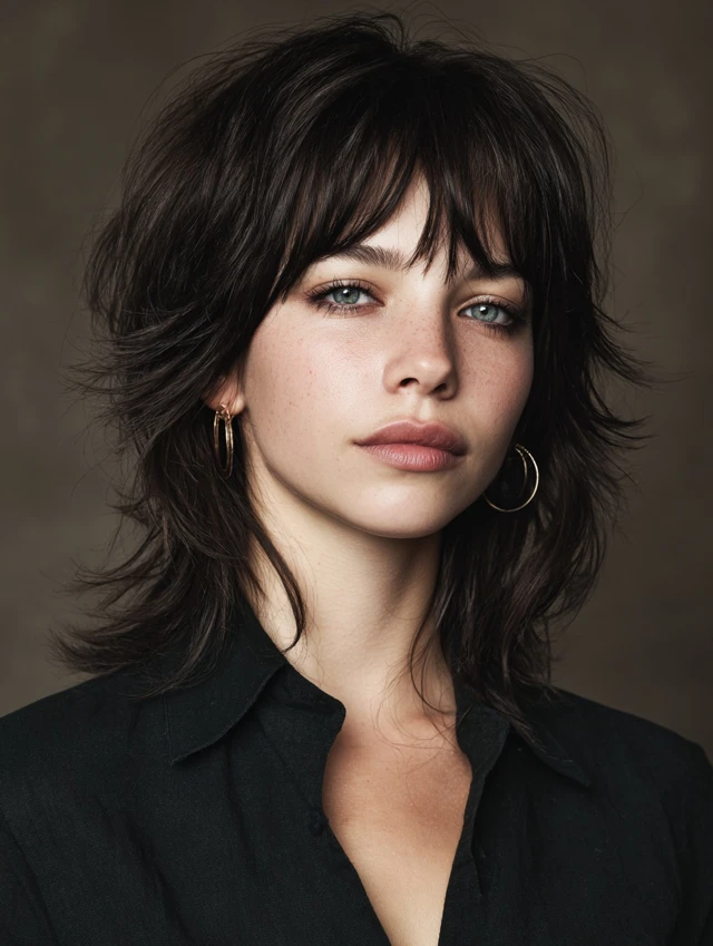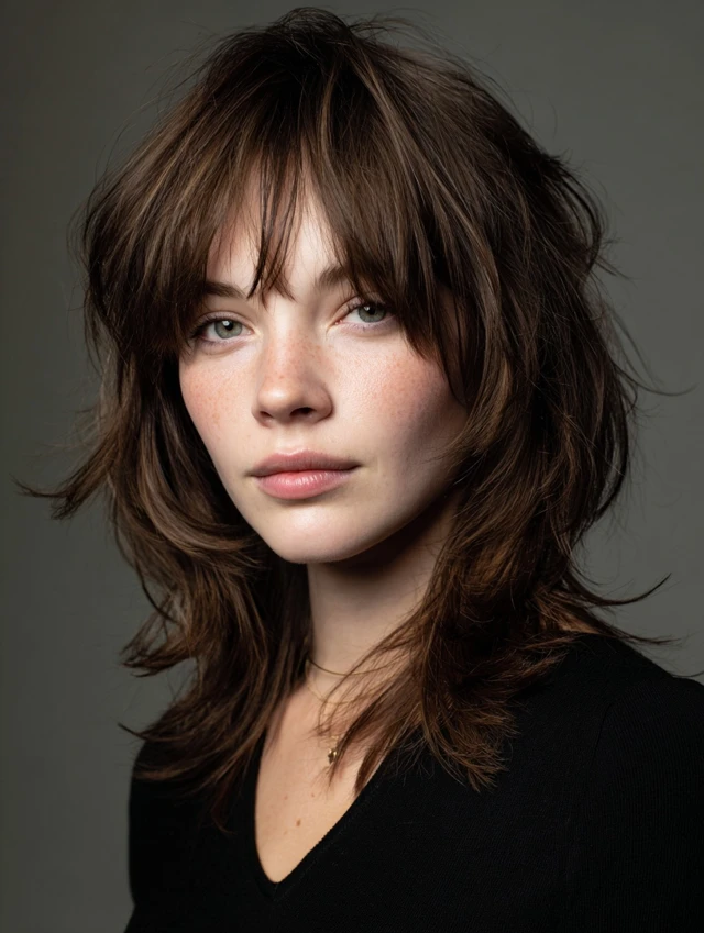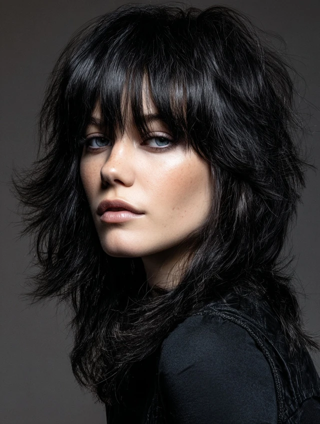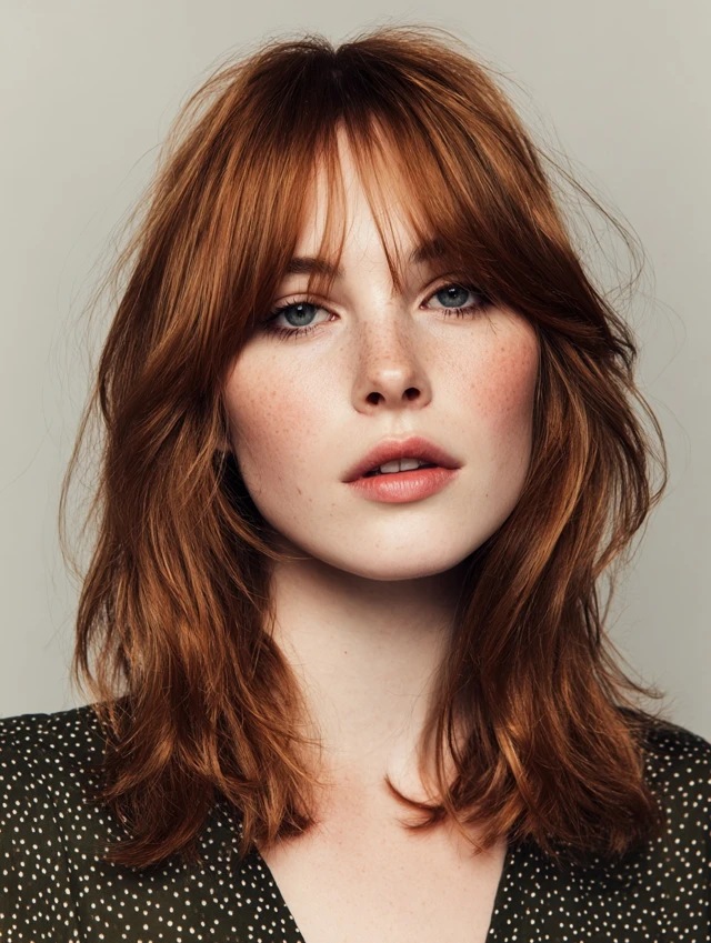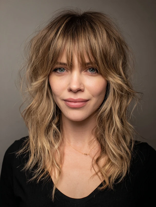 A shag uses messy layers and full fringe to disguise the top of the face naturally. The broken outline keeps things relaxed and modern rather than heavy or blunt.