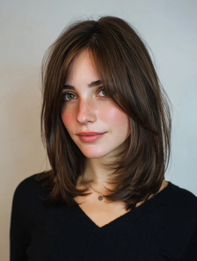 Fine to medium hair benefits from feathered ends. Blow-dry lightly for movement. This style works for everyday routines and dressier plans. Keep bangs trimmed so they stay airy.