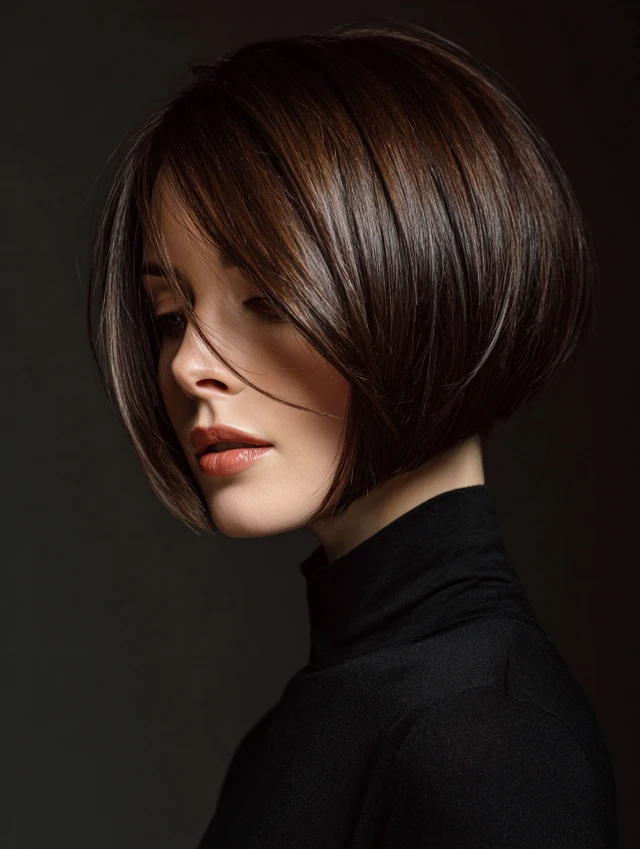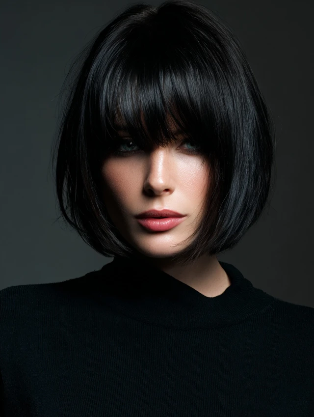 A bob paired with angled bangs breaks up forehead height using diagonal lines. The sweep draws attention to the cheekbones and eyes instead of the hairline. It flatters round and square faces by adding softness.