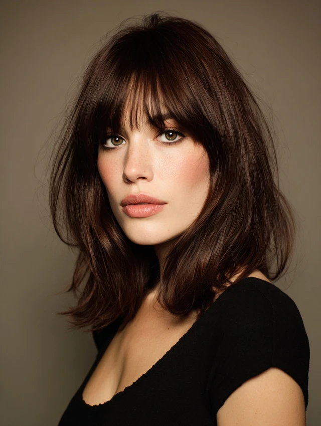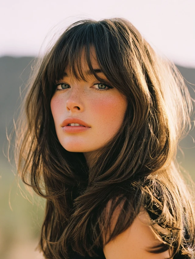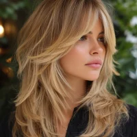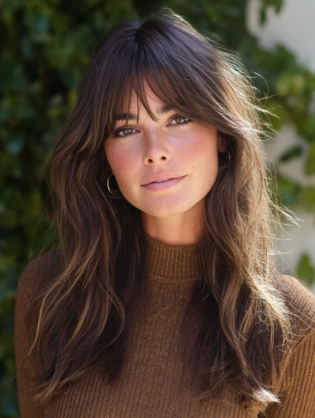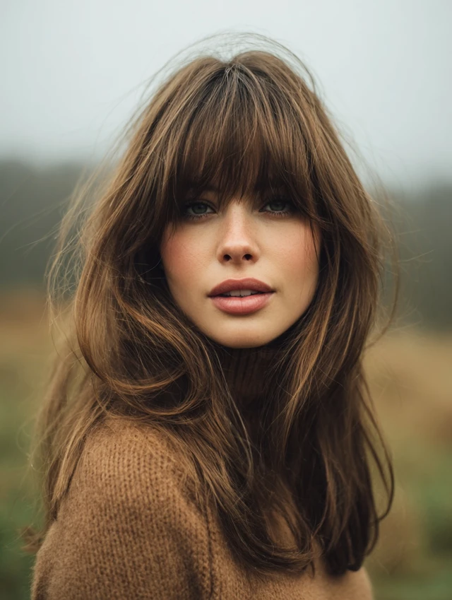 Long layers paired with wispy bangs create flow and softness. This style works well for round and square faces because the layers elongate the silhouette. The light fringe keeps the front balanced.