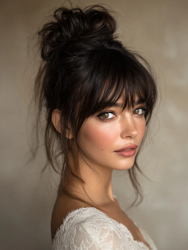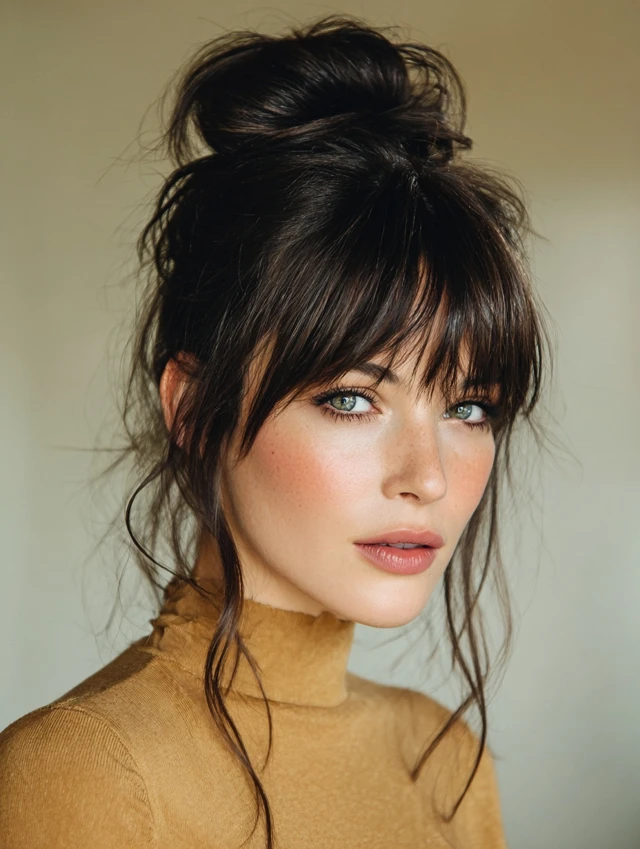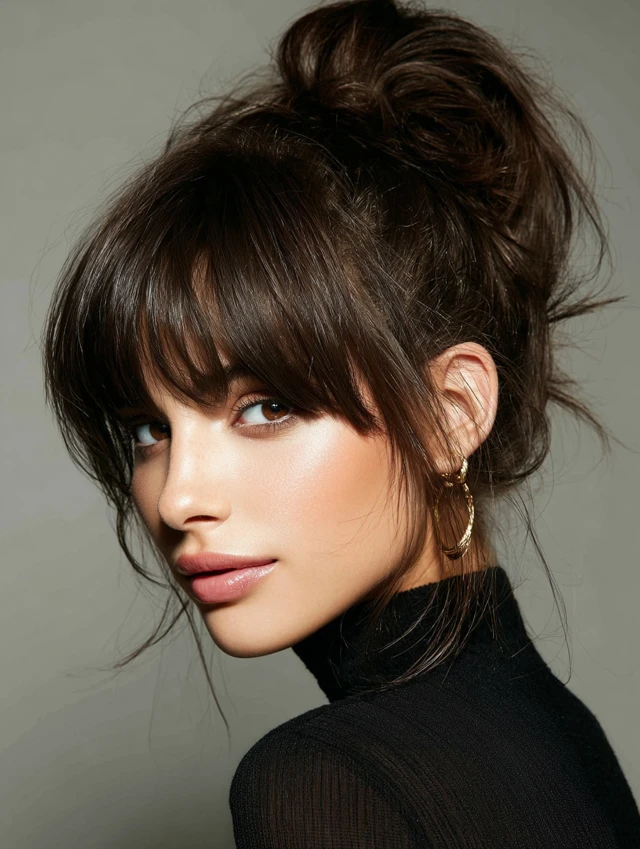 A high ponytail paired with wispy bangs creates contrast. The pulled-back hair adds lift, while the fringe keeps the look soft. This works well for round faces because it elongates the shape.