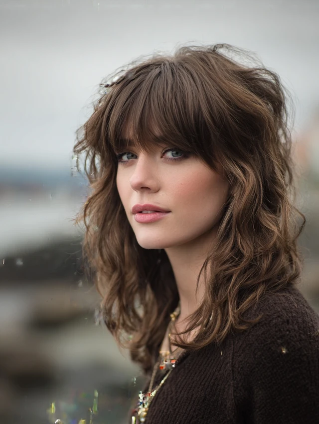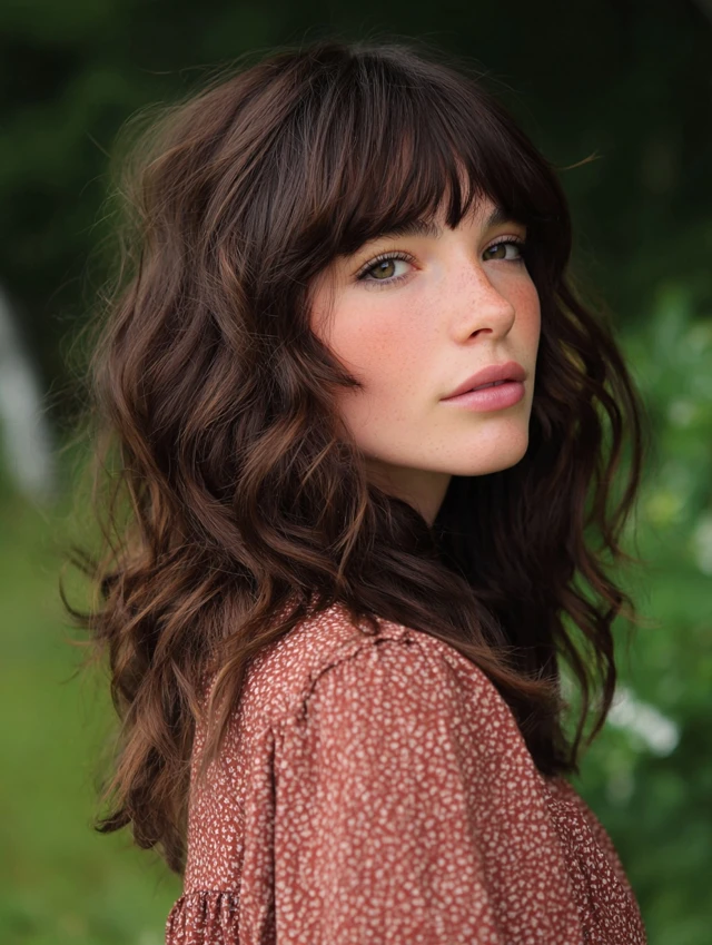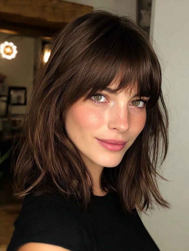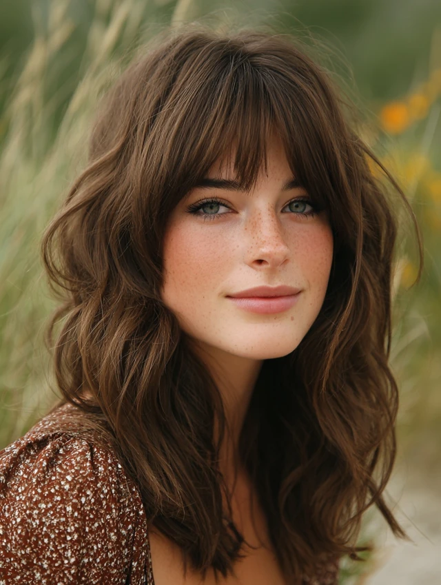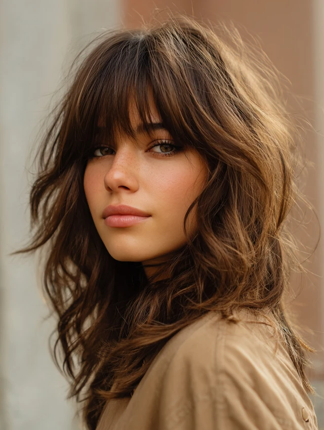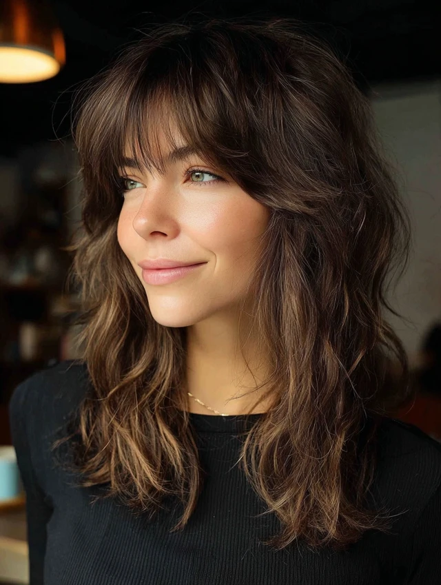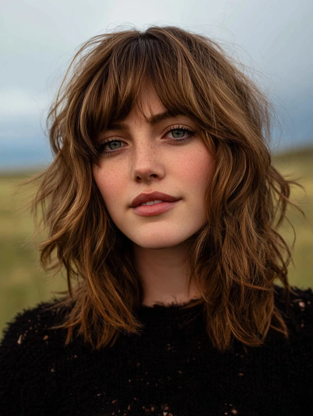A soft shag already includes layers, so wispy bangs blend naturally. This style works well for wavy textures and round faces. The volume at the crown adds height.