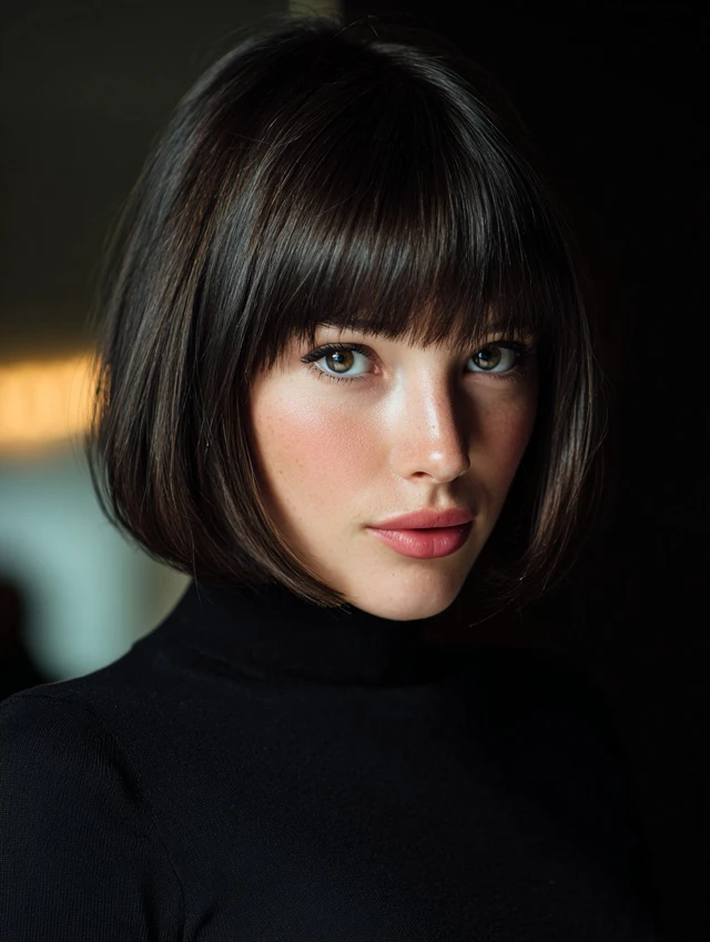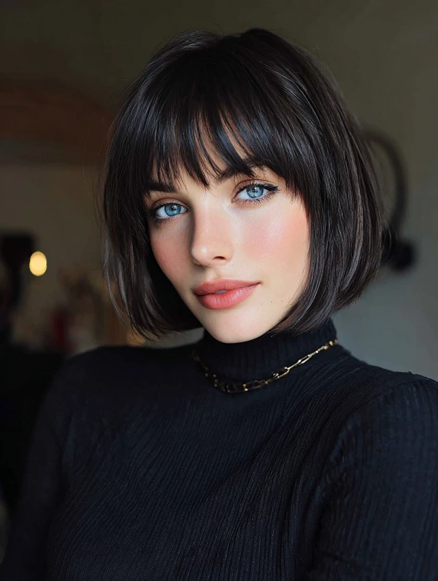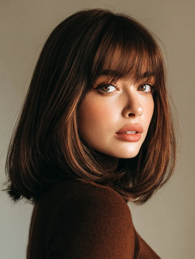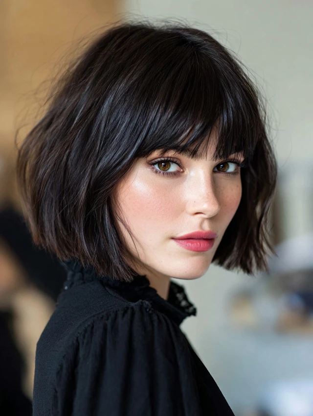 A bob with wispy bangs looks fresh and modern. The lighter fringe softens the sharp edges of the bob. This works well for square and oval face shapes.