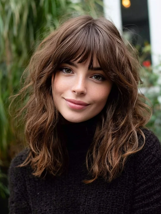 Adding wispy bangs to a medium wavy cut enhances softness. The waves add texture, while the bangs frame the eyes. This works well for heart and long face shapes.