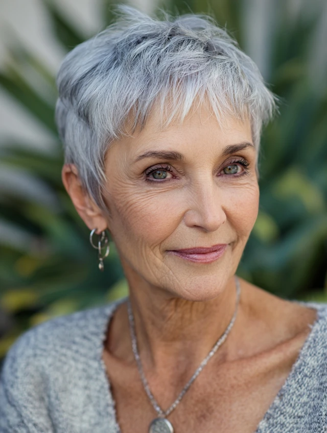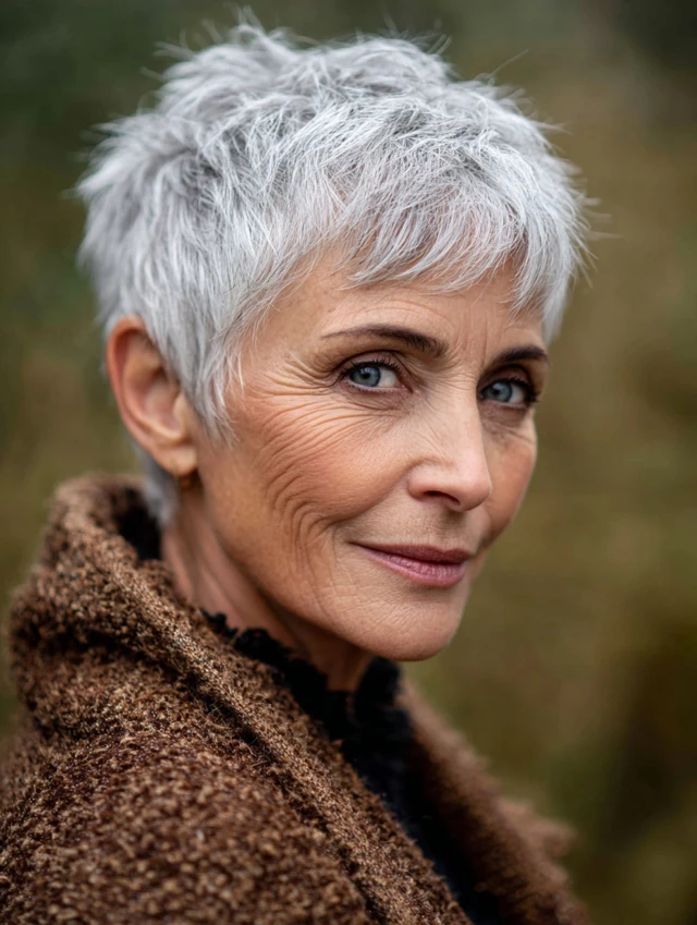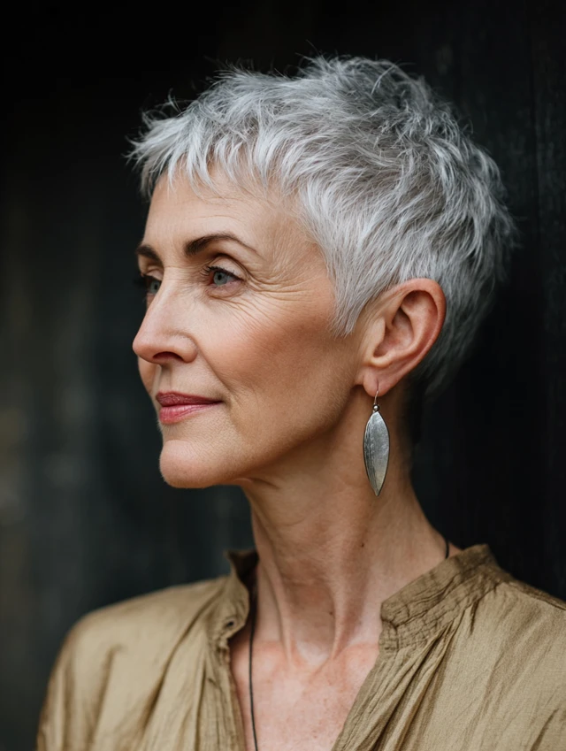 A soft pixie adds texture and definition without looking harsh. This is ideal for thinning hair because shorter layers create fullness at the crown. It highlights cheekbones and eyes.