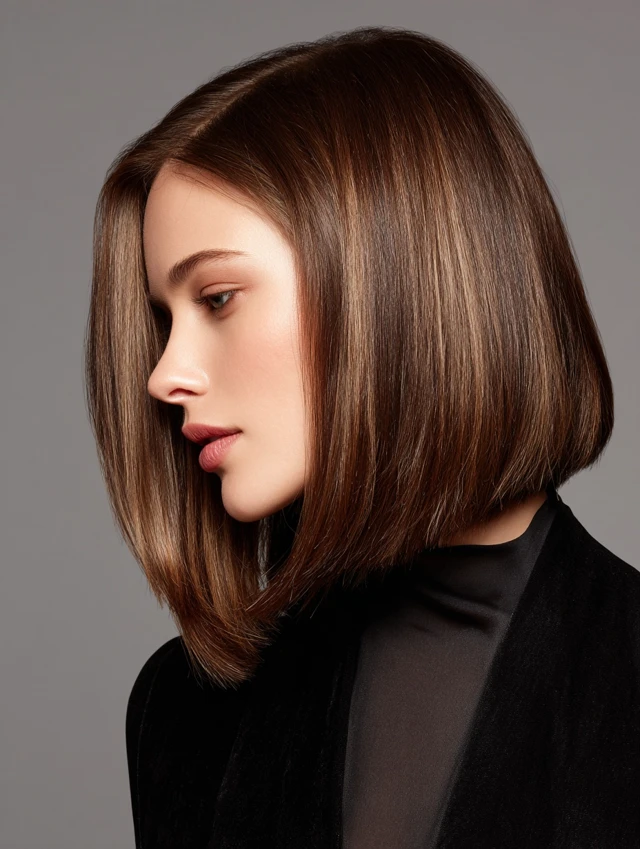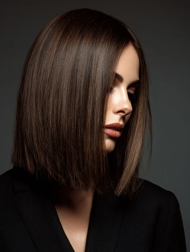 This version keeps the ends straight and strong while hiding layers inside for lift. The clean outline feels polished without weighing hair down. Oval and rectangular faces handle this structure well.