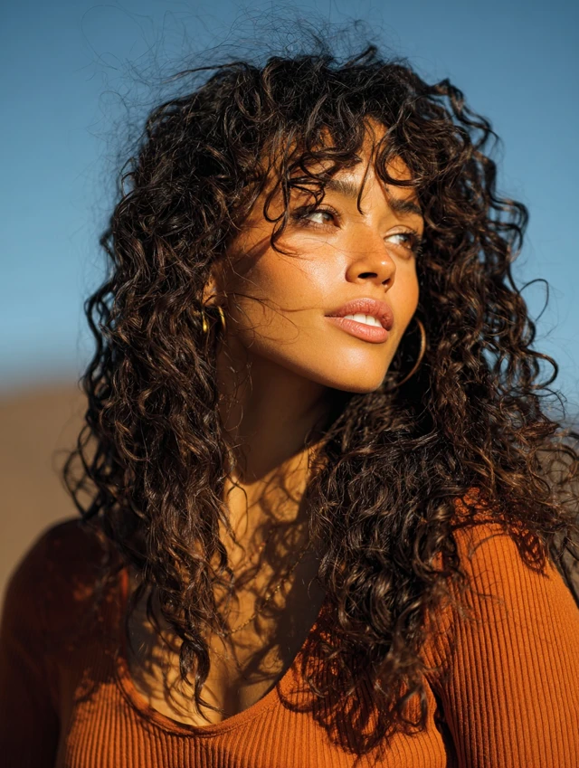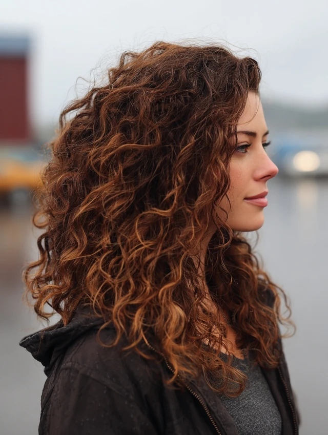 Use leave-in conditioner and curl-defining products. Diffuse gently to maintain volume. The layered shape highlights cheekbones and eyes. It works well for social events and everyday wear since curls add natural drama.