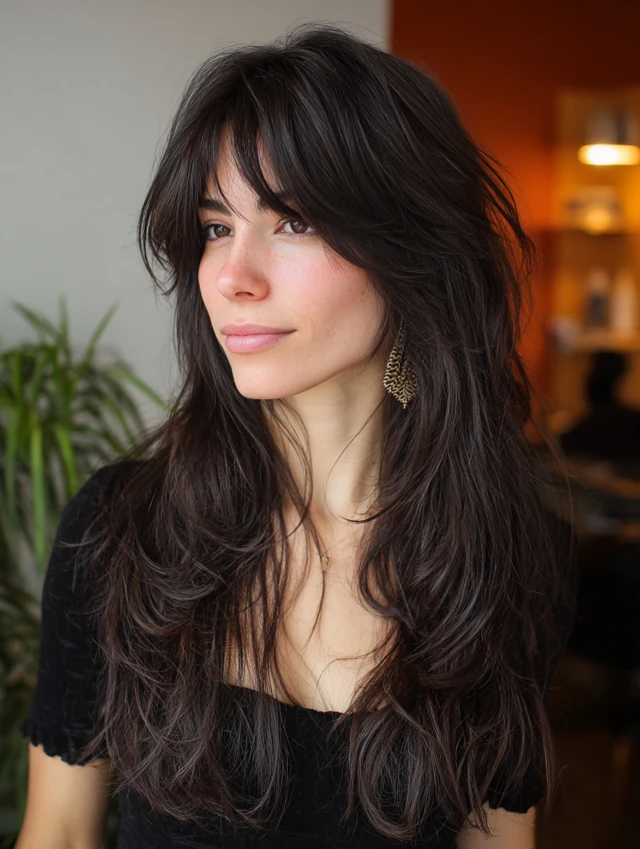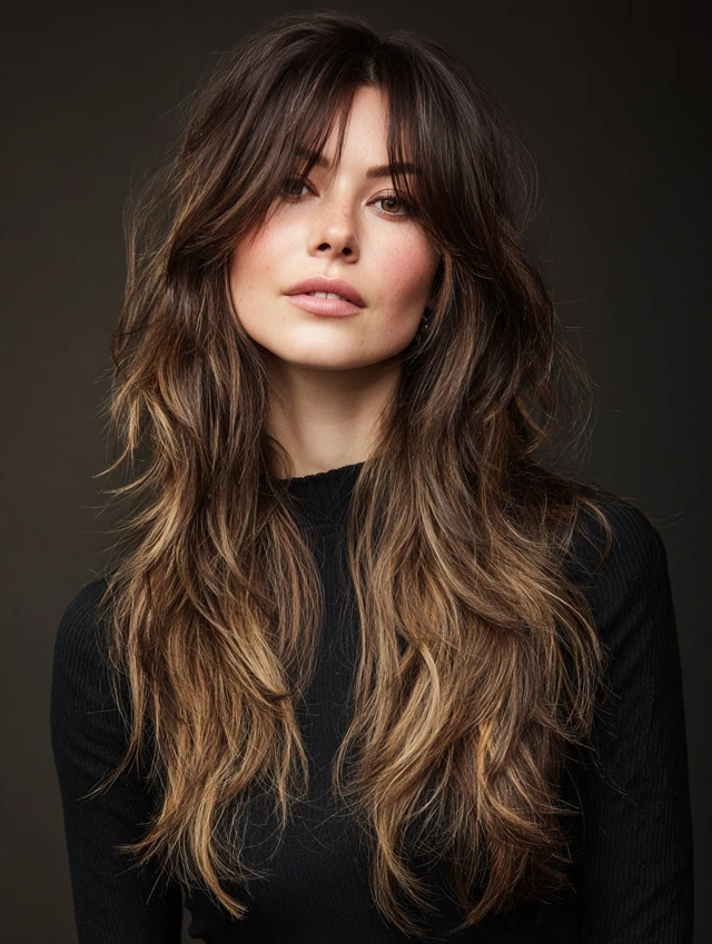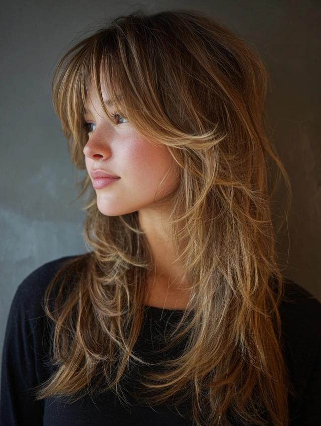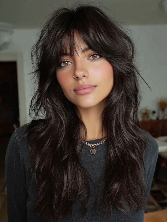 This long wolf cut pairs textured layers with curtain bangs. The bangs frame your cheekbones and soften strong jawlines. It works especially well for oval and heart-shaped faces. Medium to thick hair holds the layered shape best.