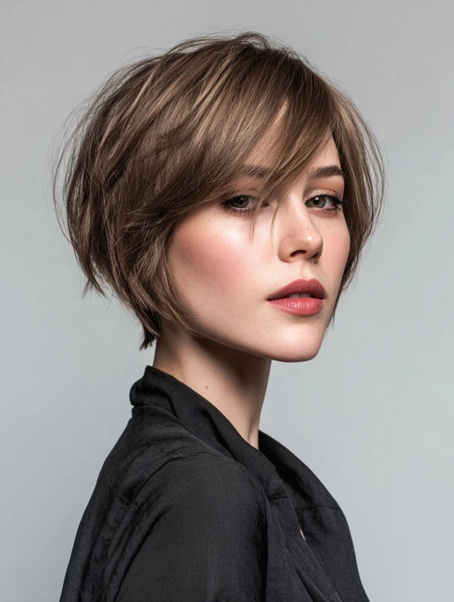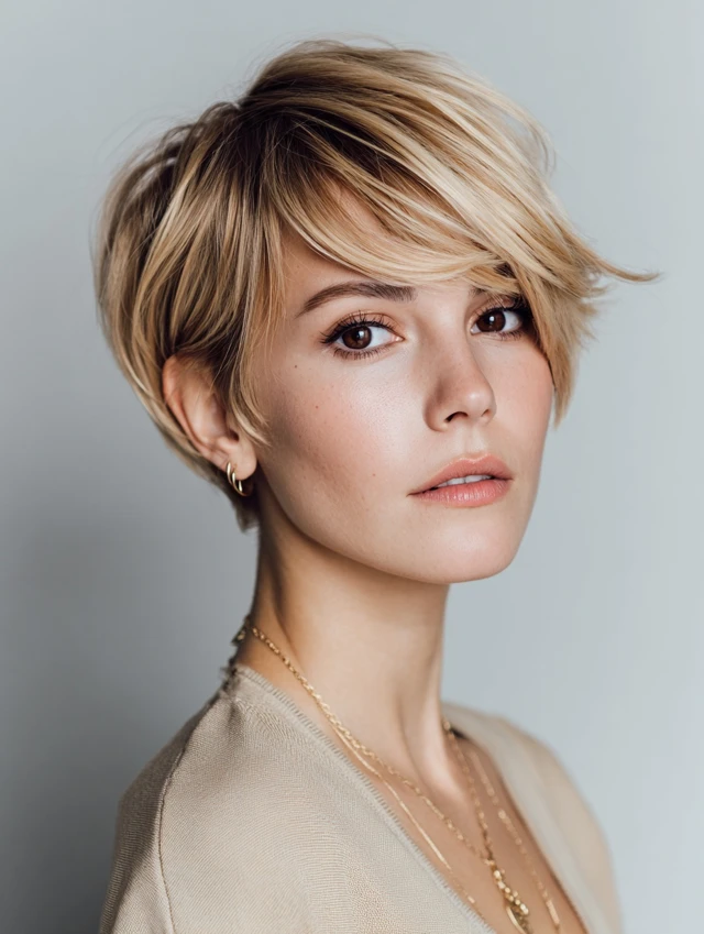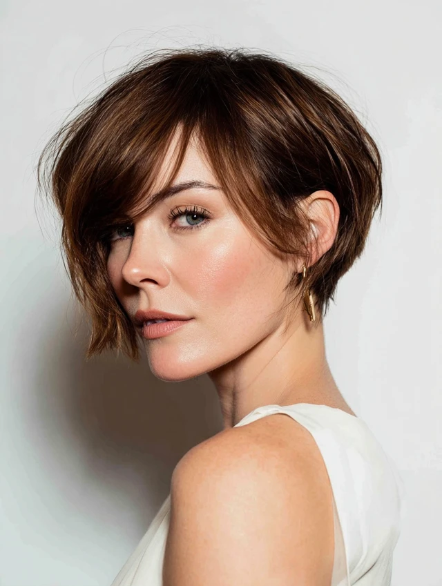 A pixie-bob leaves length in front while tapering the back. That balance gives flexibility without daily heat styling. The front pieces frame the face and soften the overall look.