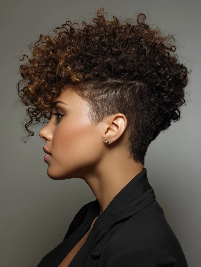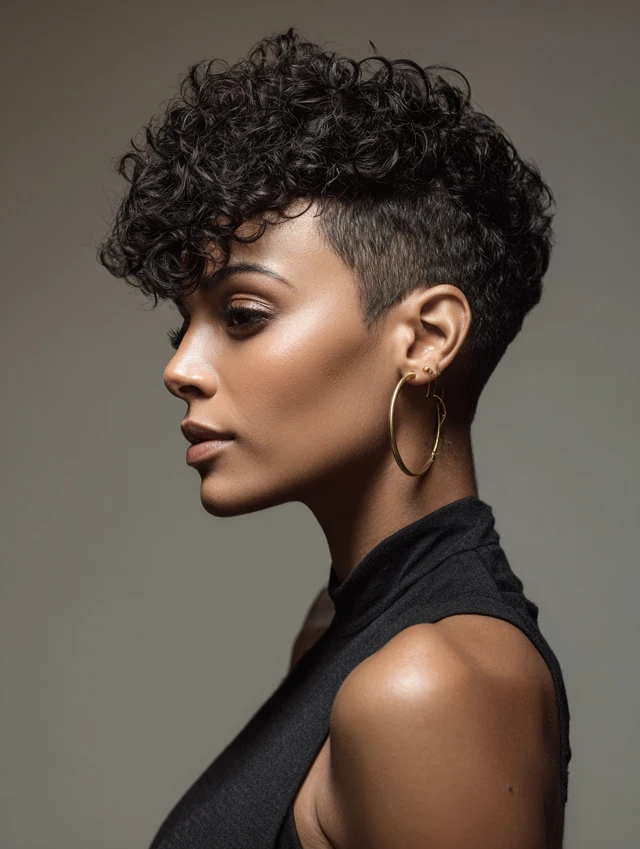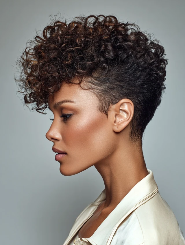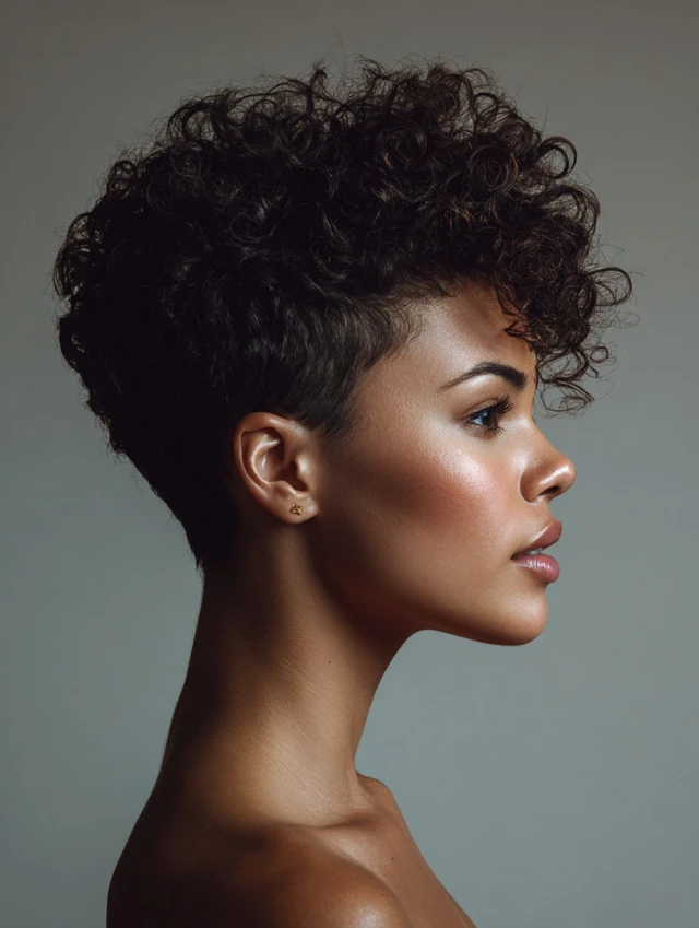 This style keeps sides and back neat while leaving curls fuller on top. The clean shape reduces daily styling time and controls shrinkage around the edges. It highlights bone structure and keeps hair lightweight.