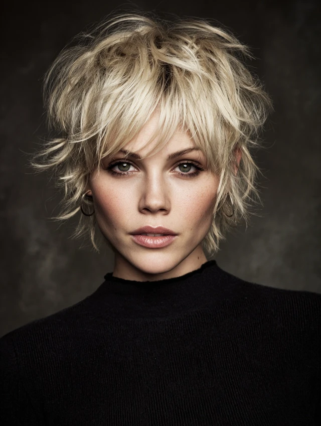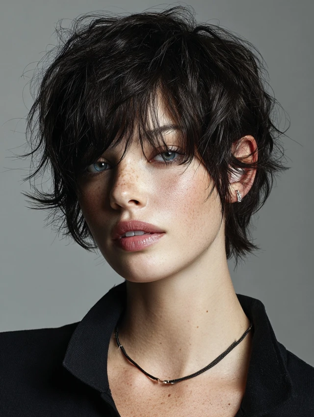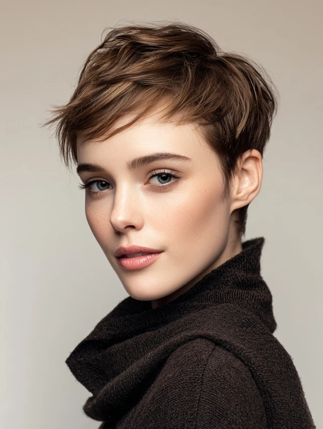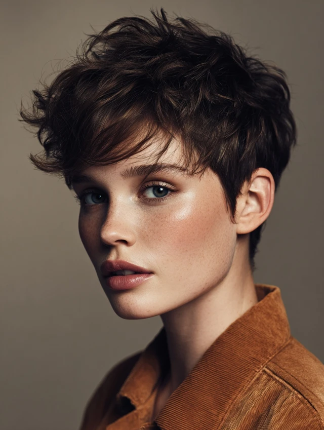 A pixie keeps the sides tidy and leaves a little length on top for shape. It flatters most face shapes by highlighting eyes and cheekbones. The short length means less drying time and almost no tangles.