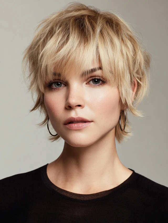 A short shag spreads layers across the head, which boosts volume and softens features. Wispy bangs help disguise regrowth at the hairline. The relaxed outline keeps the style forgiving.