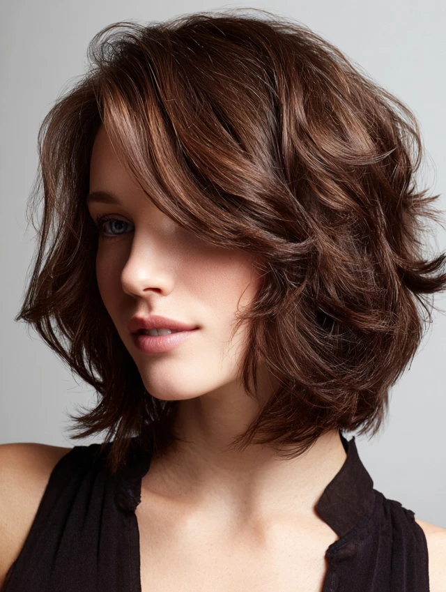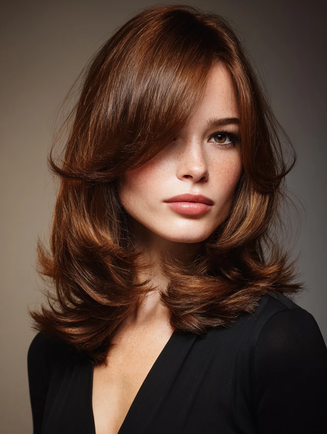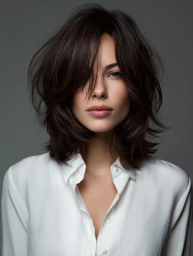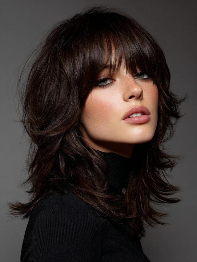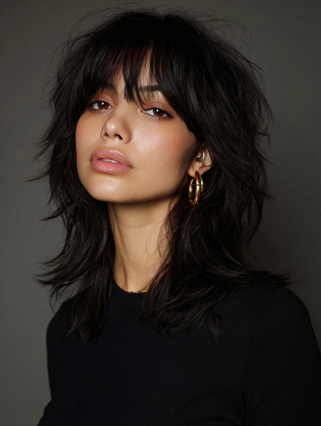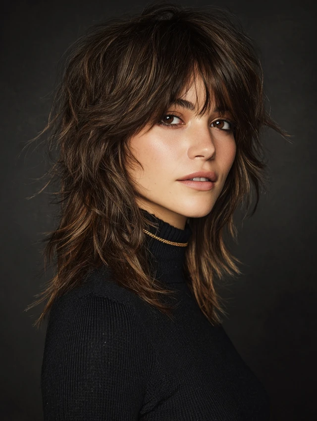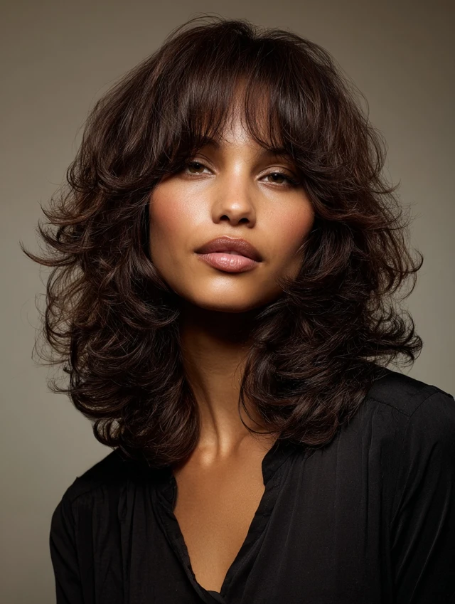 A medium shag uses shorter crown layers and feathered ends to break up density. Curtain bangs add softness and draw attention toward the eyes. It works well for round or square faces by adding vertical movement.