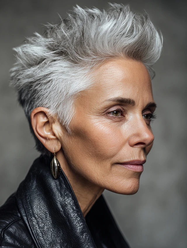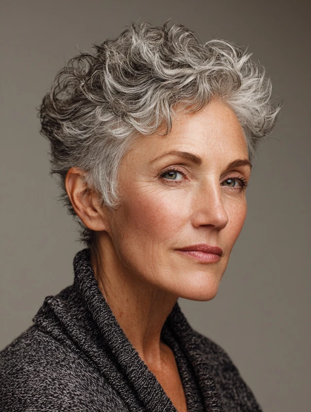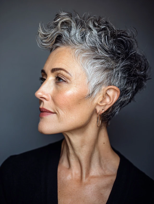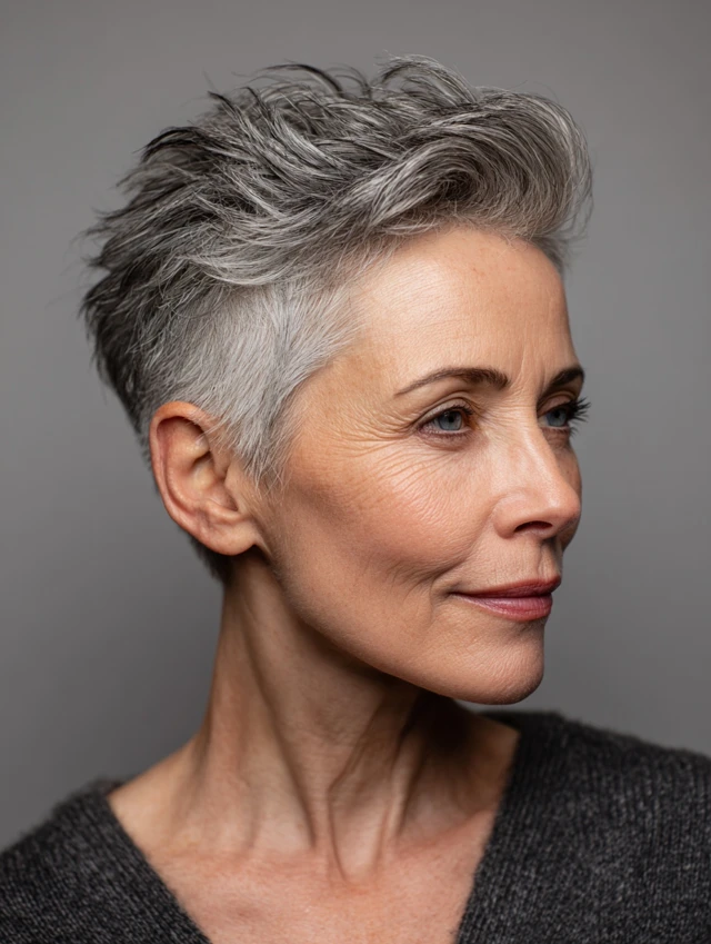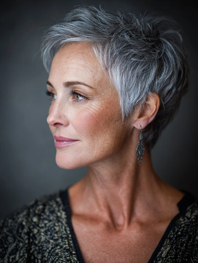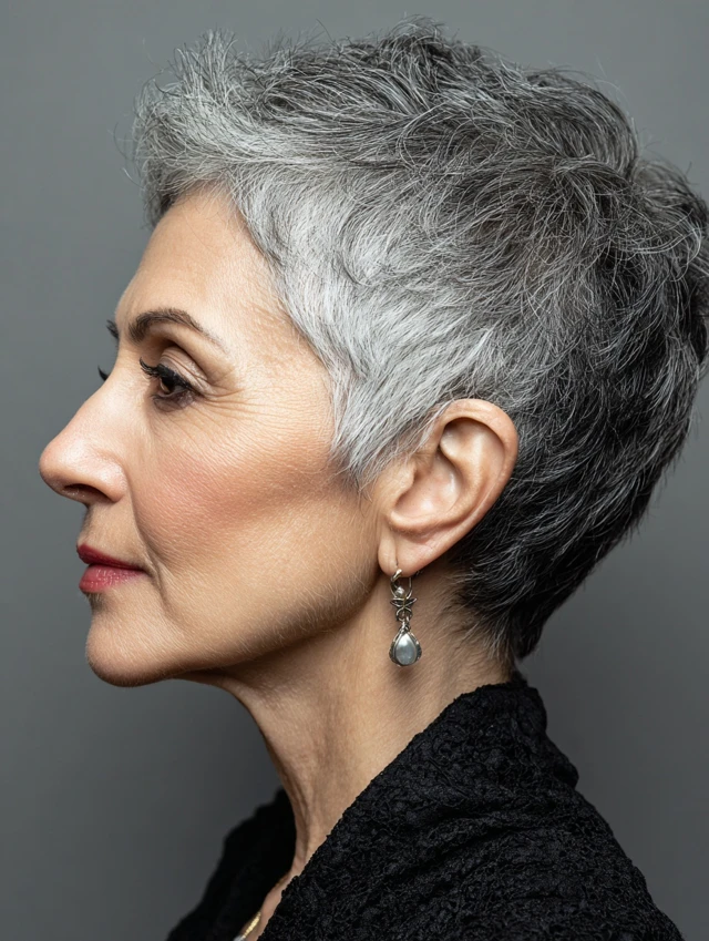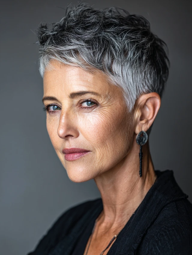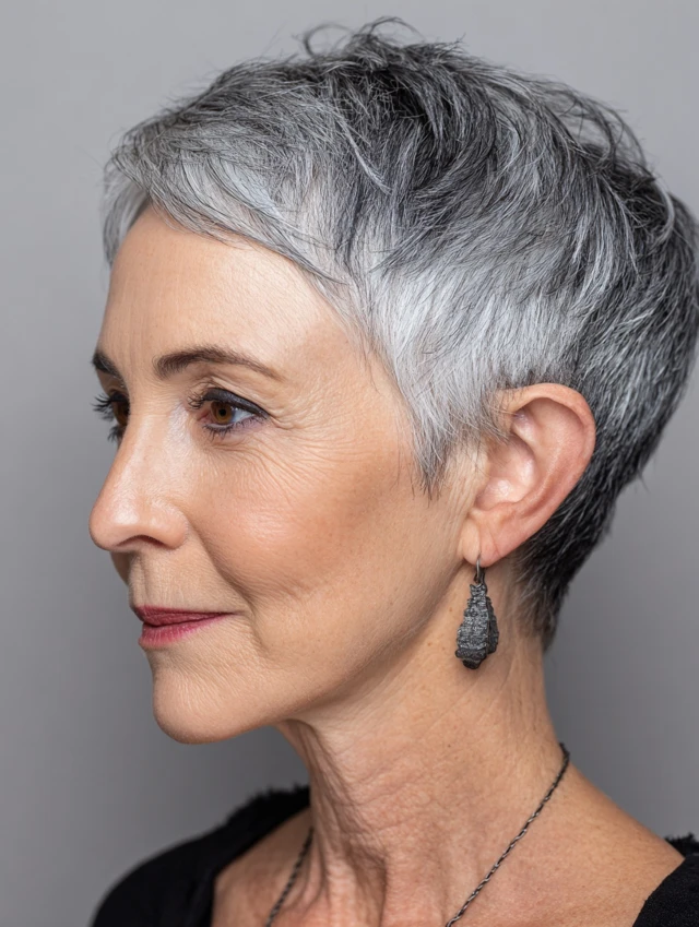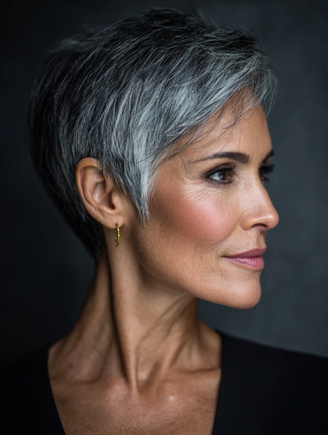 A pixie with a deep side part emphasizes facial features and highlights gray tones. The cut is chic, easy to maintain, and perfect for those wanting low-effort sophistication. Oval and square faces look balanced with this cut.