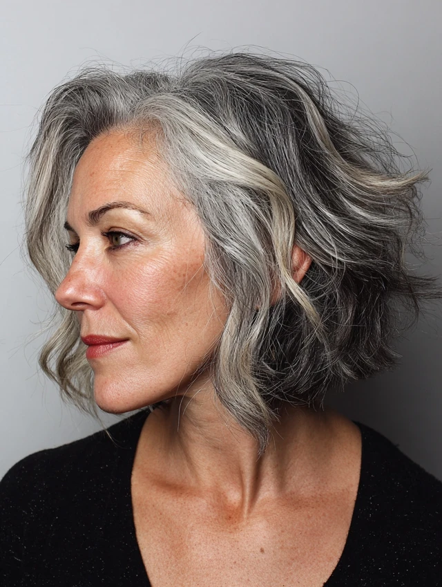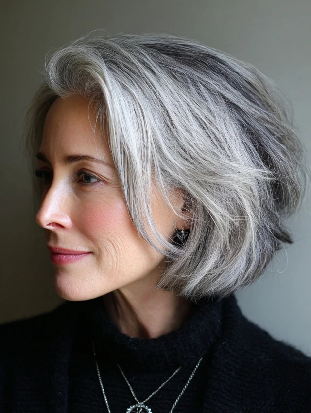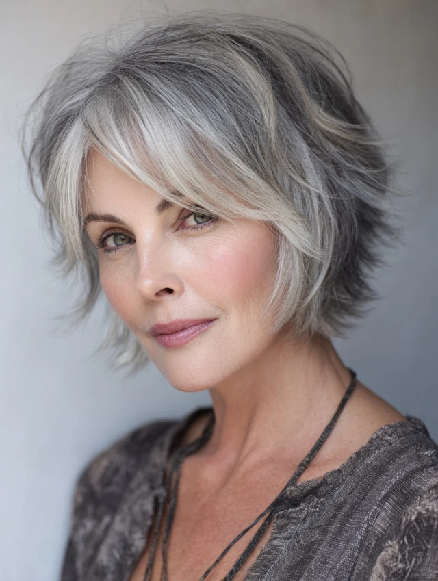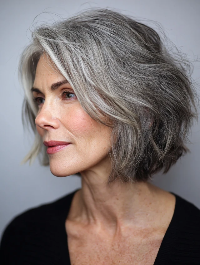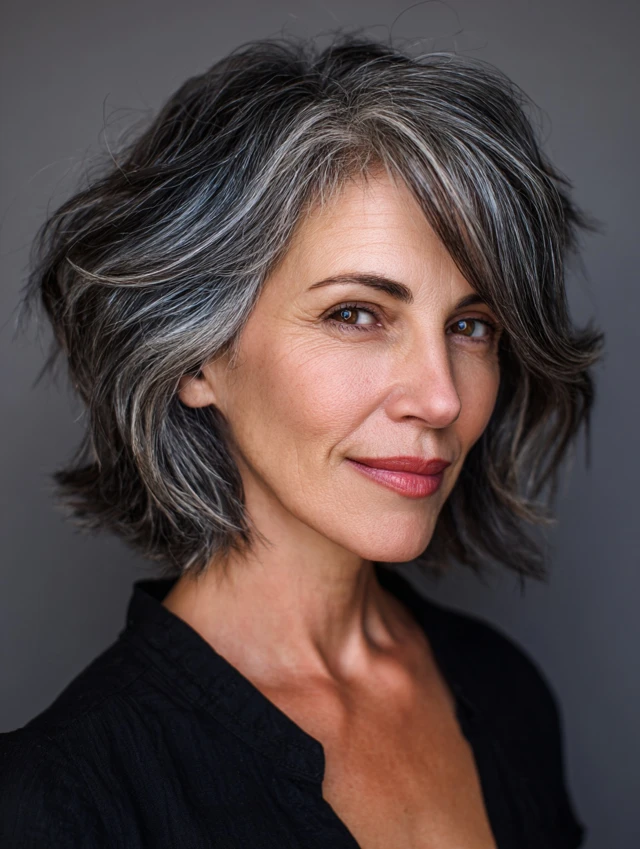 A textured bob adds movement and dimension, perfect for salt and pepper strands. Soft layers at the ends create a lively, youthful feel while keeping it classy. It works for oval and heart-shaped faces.