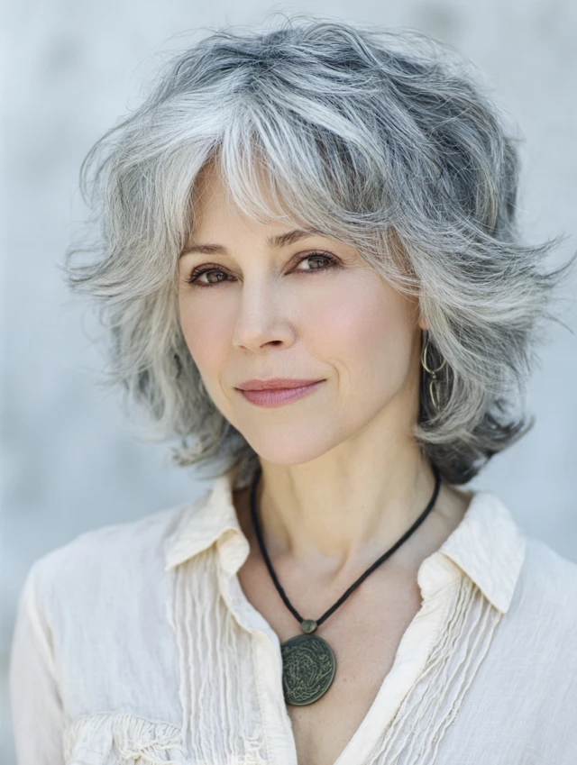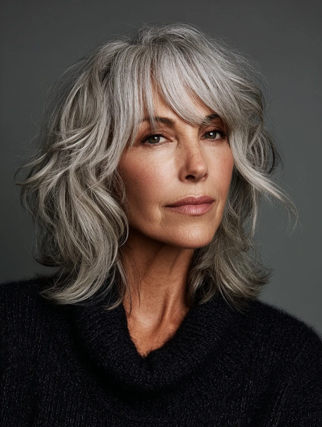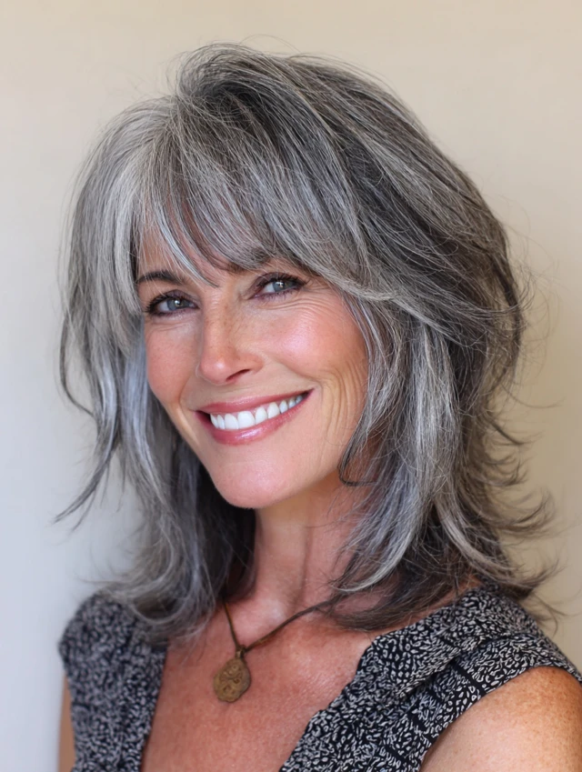 A soft shag cut adds texture and movement to salt and pepper hair. Layers create volume and prevent thin areas from looking flat. It works well for round, oval, and long faces.