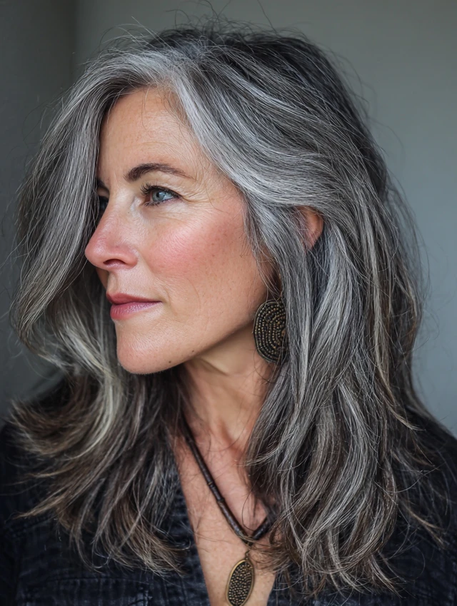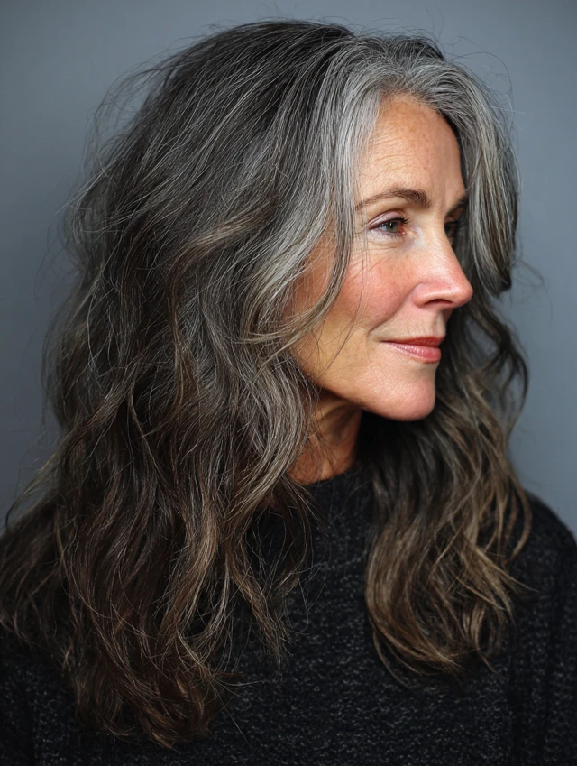 Long layers soften mature features while showing off salt and pepper tones. Gentle waves add texture without heavy styling. This cut suits oval, diamond, or long face shapes.