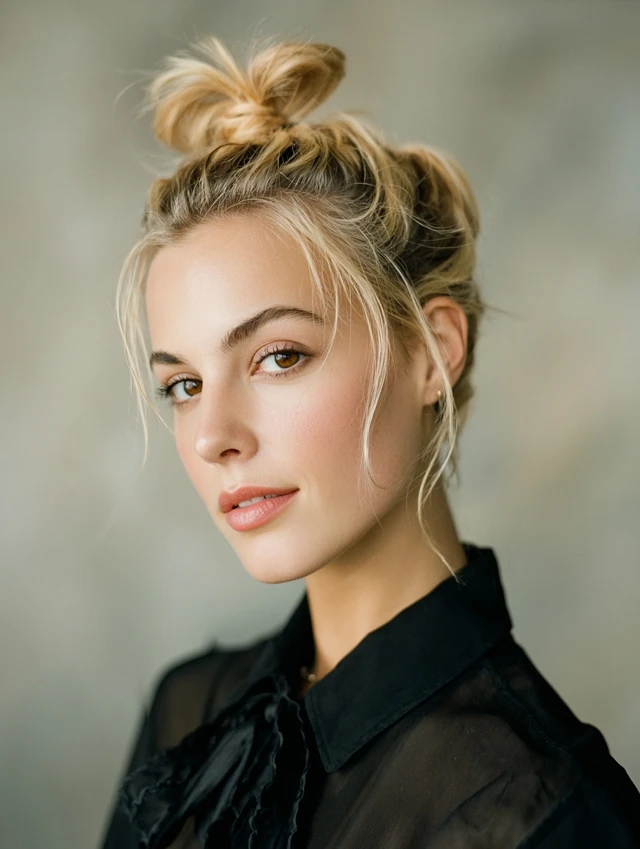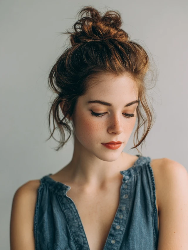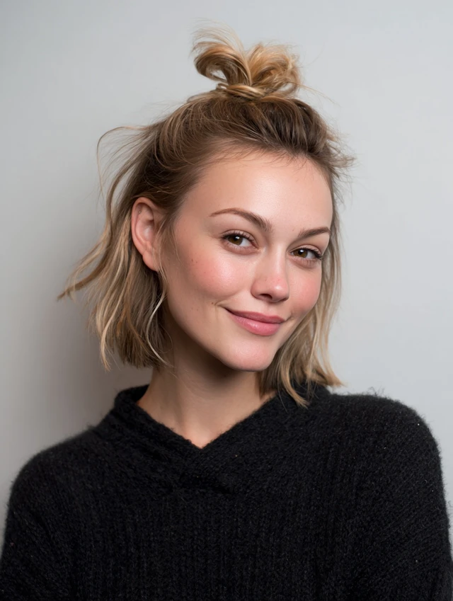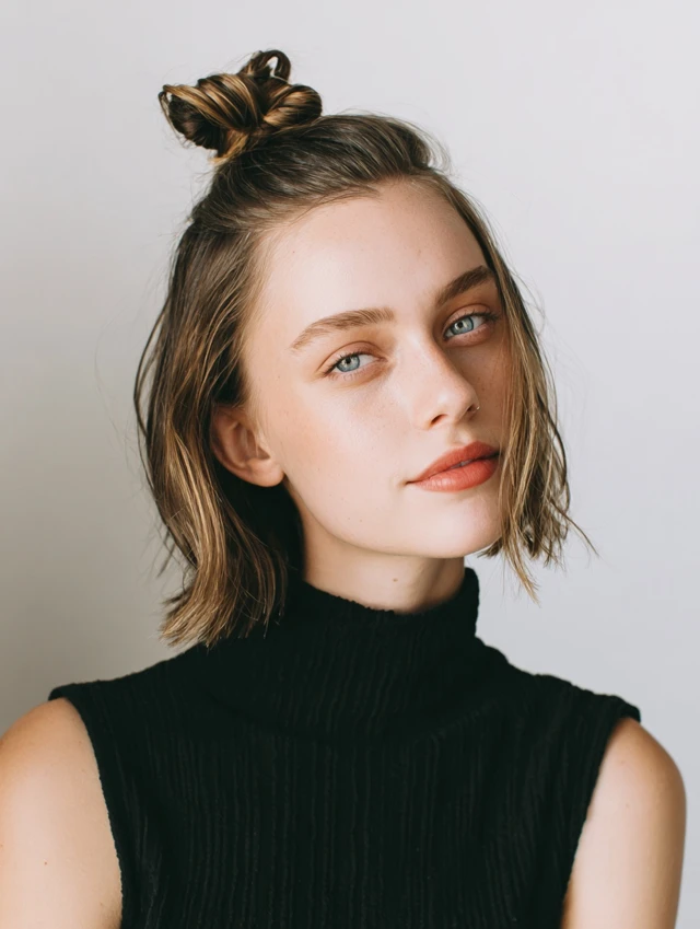 A mini bun at the crown gives instant polish with personality. The lifted shape draws the eye upward and keeps hair out of your face. It suits round faces by adding height and visual length.