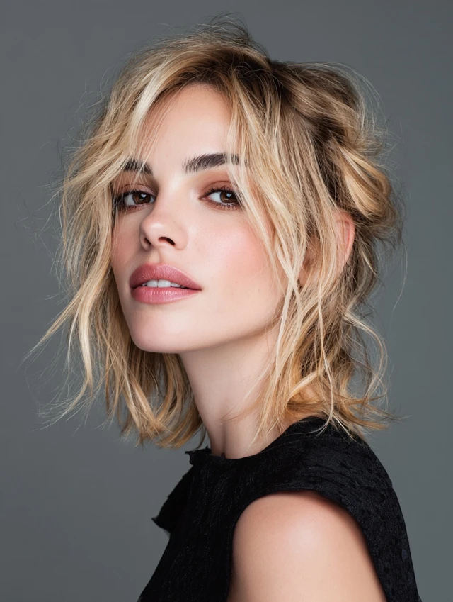 This relaxed version lifts the crown and leaves soft waves underneath. It gives casual volume and a lived-in feel. Oval and long faces benefit from the added width around the cheeks.