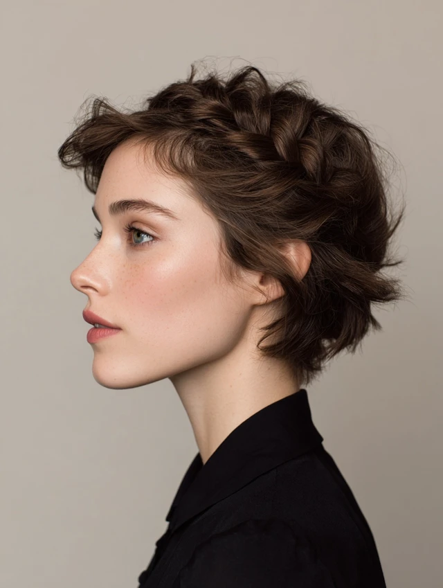 Small braids run along the sides and pin back at the crown. They add interest while keeping hair controlled. This works well for square or angular faces because the curves soften sharp lines.