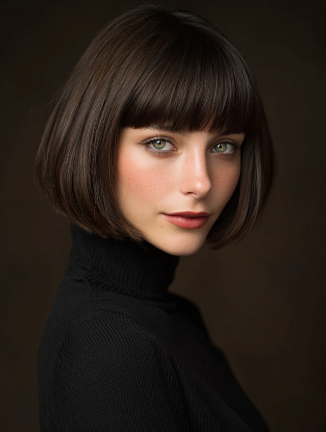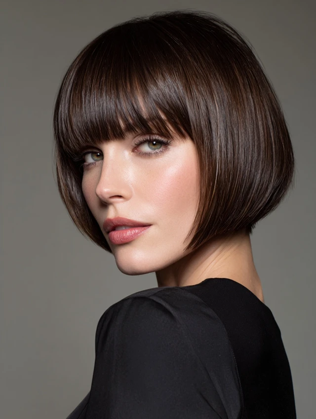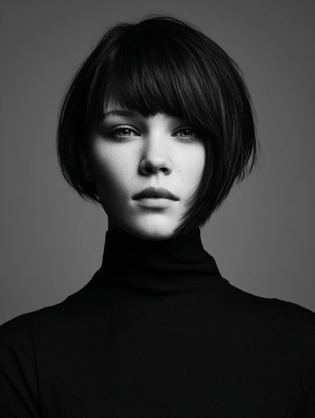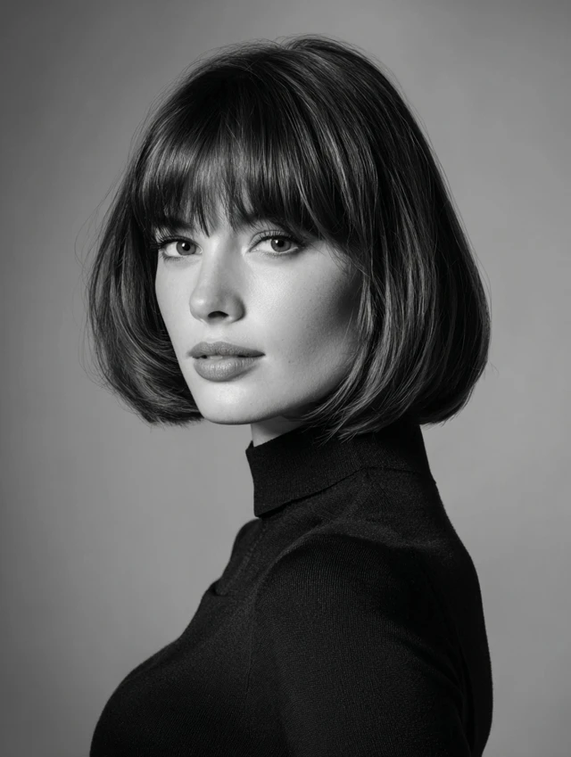 This take keeps the bob neat with stacked layers in back and blunt bangs across the front. The contrast looks bold and clean. It suits longer face shapes because the fringe shortens the look and centers attention on the eyes.