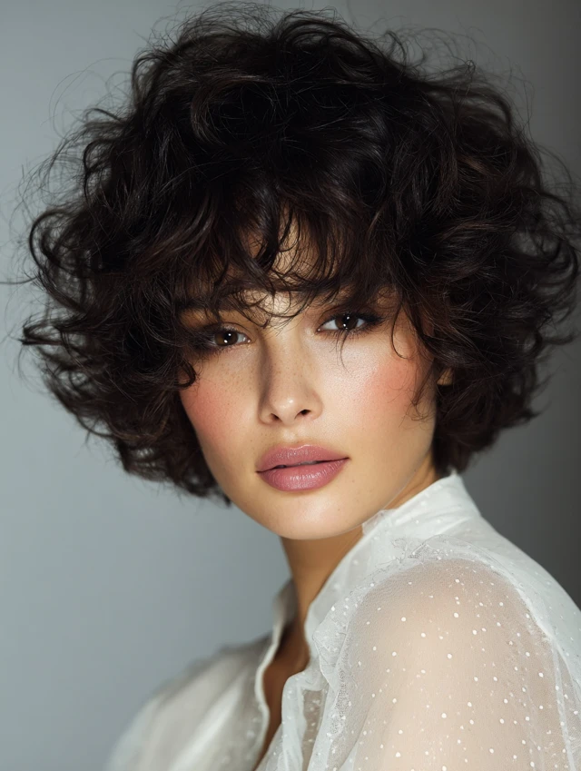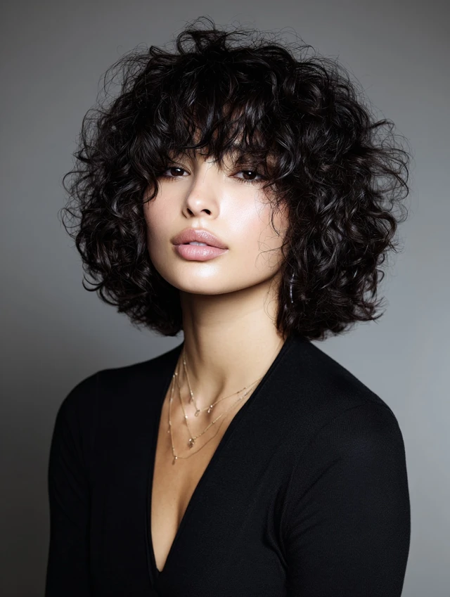 This version stacks layers to support curl shape and prevent triangle volume. The bangs stay curly and soft, not blunt. It suits round and oval faces by adding height at the crown while keeping sides controlled.