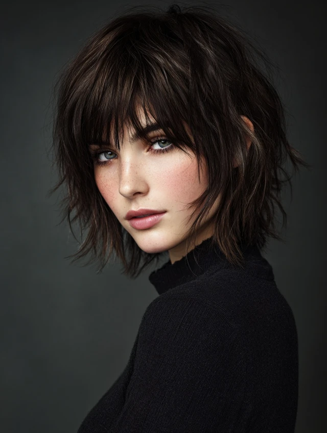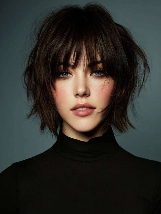 Choppy layers cut in uneven lengths add edge and texture. The bangs look piecey instead of blunt, which keeps the style playful. This version flatters round or square faces by breaking up strong lines and adding vertical movement.