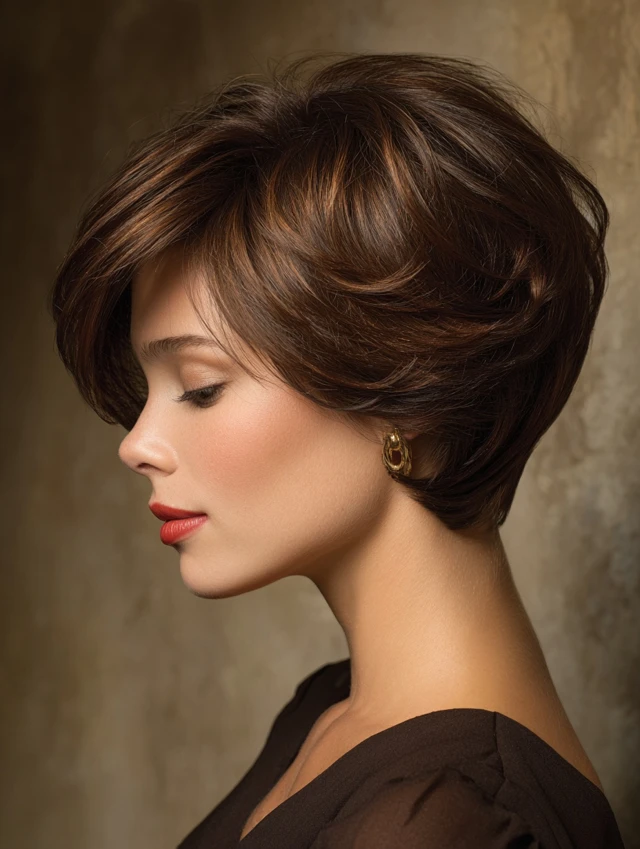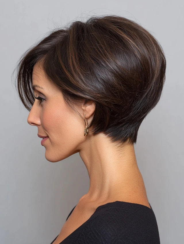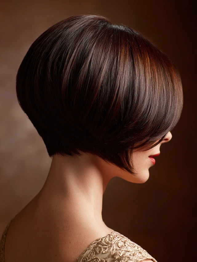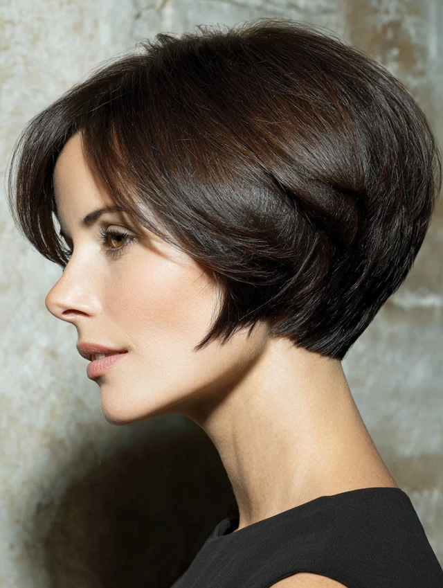Blow-dry with a round brush to enhance the stacked shape. Keep the ends tucked inward. This look fits professional settings and everyday routines. Regular trims keep the stacking crisp.