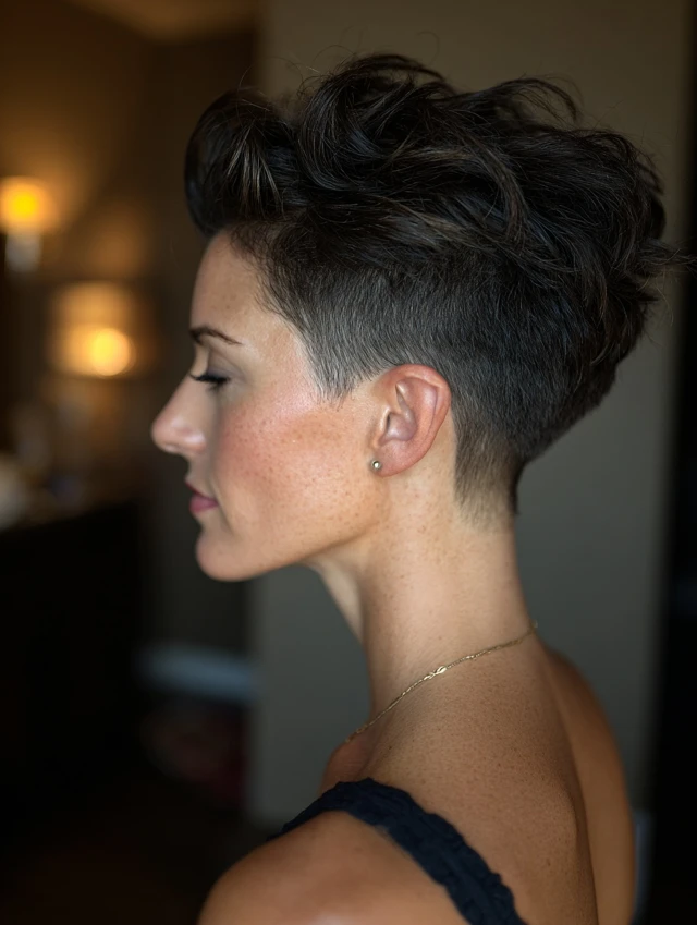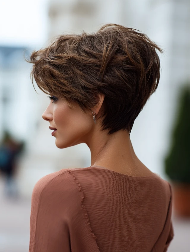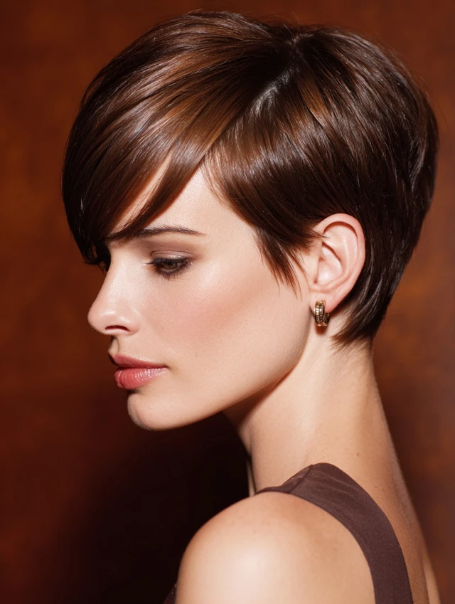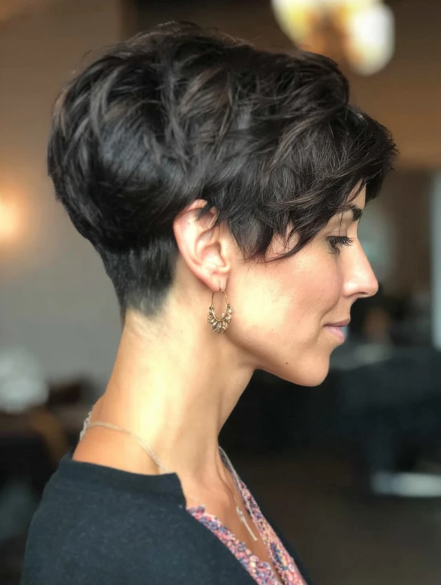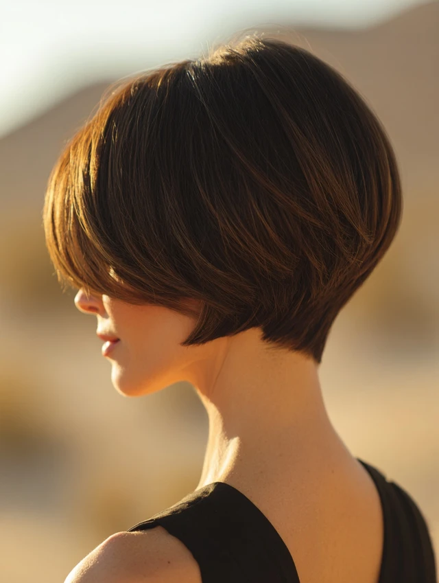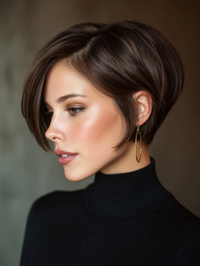 The short stacked wedge haircut builds volume at the back while keeping the front sleek and controlled. It features stacked layers at the crown that create lift and shape. The front usually angles slightly longer to frame the face. This cut feels structured and polished. It works well for fine hair that needs body and for thick hair that needs control. If you want a sharp silhouette with easy maintenance, the short stacked wedge delivers strong shape without extra length.