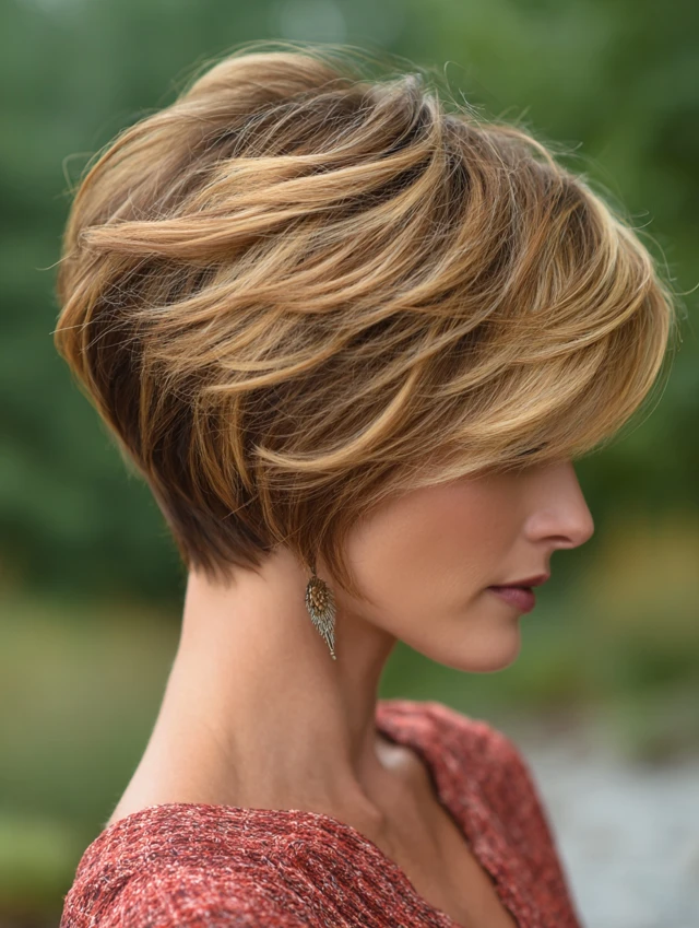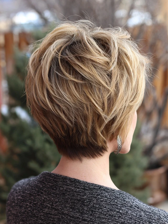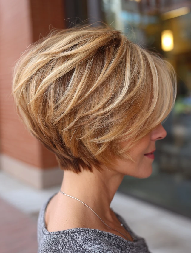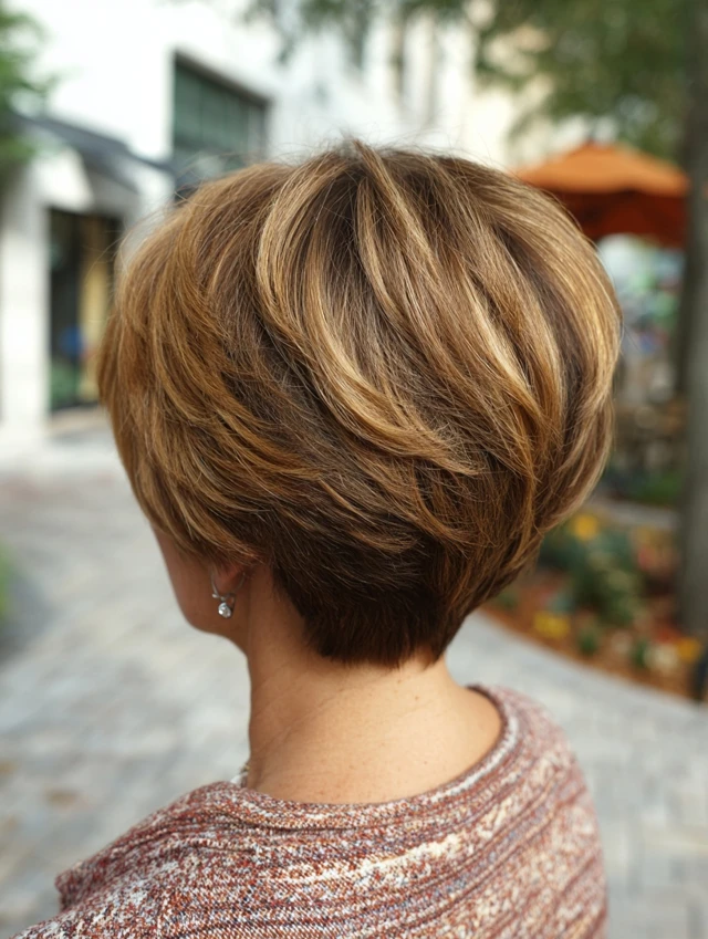 Adding subtle highlights enhances the stacked layers. The lighter pieces emphasize depth in the back. This works well for fine hair that needs extra dimension.