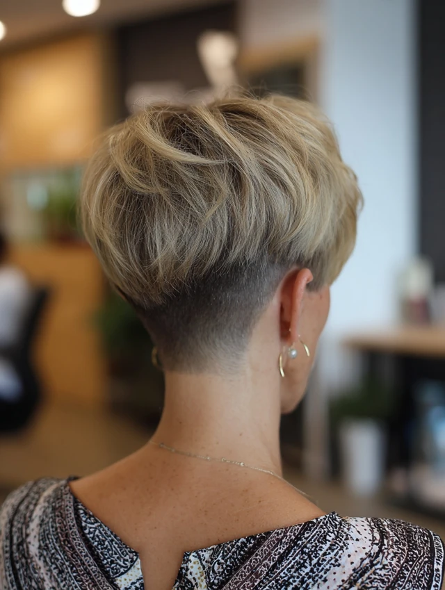 The short stacked wedge haircut delivers structure, volume, and easy styling. The lifted back and angled front create balance. It feels polished without extra effort.